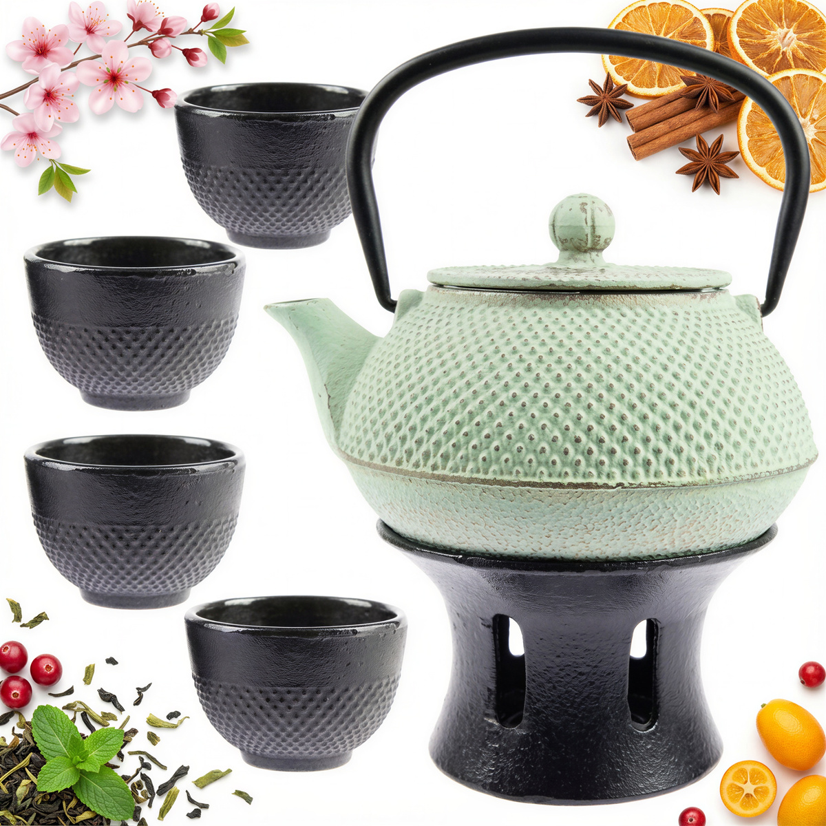ZESTAW ŻELIWNY CZAJNIK 0,8 L + 4 ŻEIWNE CZARKI DO HERBATY + PODGRZEWACZ