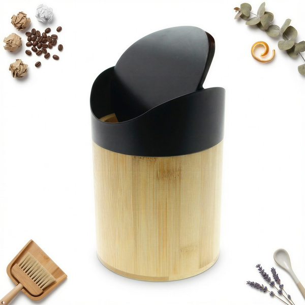 Dzięki pokrywie w czarnym kolorze i bambusowemu pojemnikowi idealnie pasuje do każdego pomieszczenia w domu.