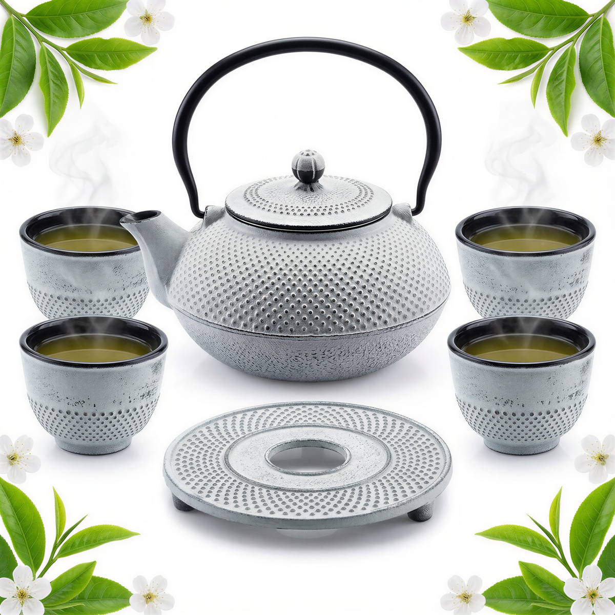 CZAJNIK 1,5L ŻELIWNY 4x CZARKI PODKŁADKA ZESTAW