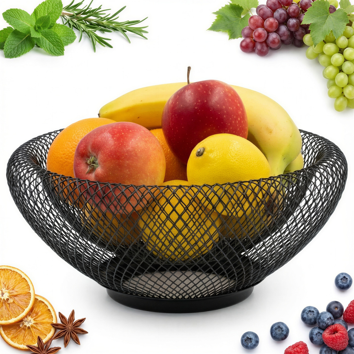 Klasyczny metalowy koszyk, w którym owoce nie tylko pięknie się prezentują, ale też nie ulegają tak łatwo zepsuciu, ponieważ dzięki otwartym ściankom mają zapewnioną cyrkulację powietrza.