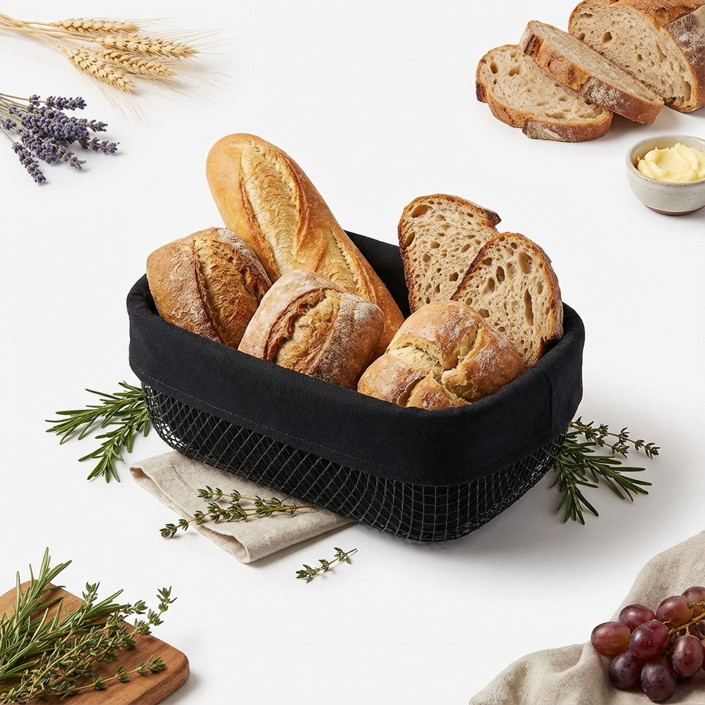 ✅Koszyk posiada czarny bawełniany pokrowiec, który ułatwia serowanie pieczywa.
