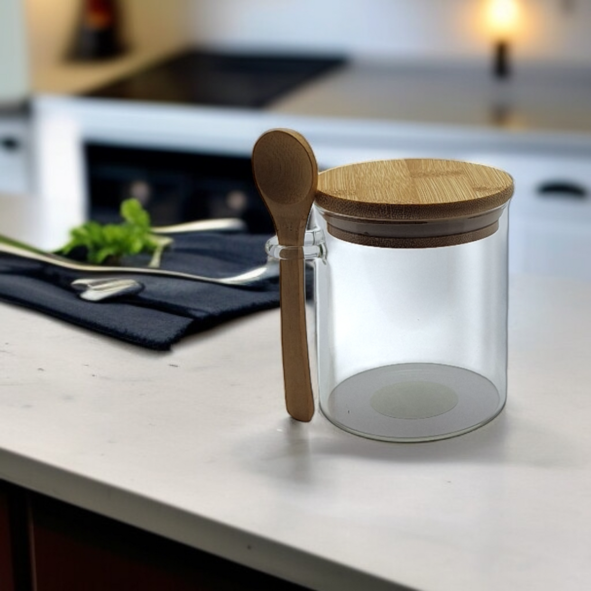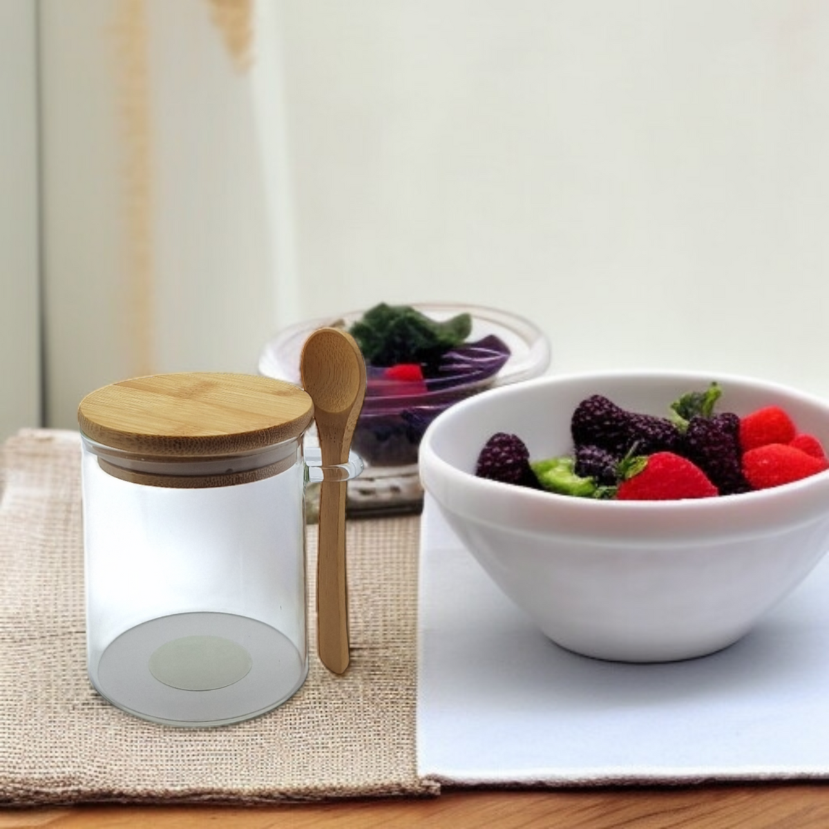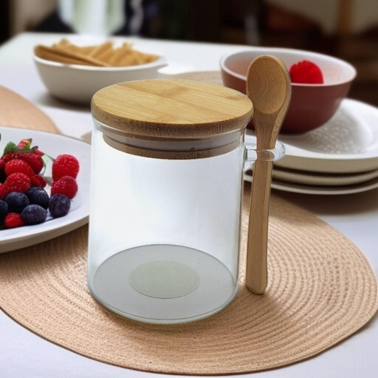 SZKLANY POJEMNIK 400 ml SŁOICZEK Z BAMBUSOWĄ POKRYWKĄ I ŁYŻECZKĄ