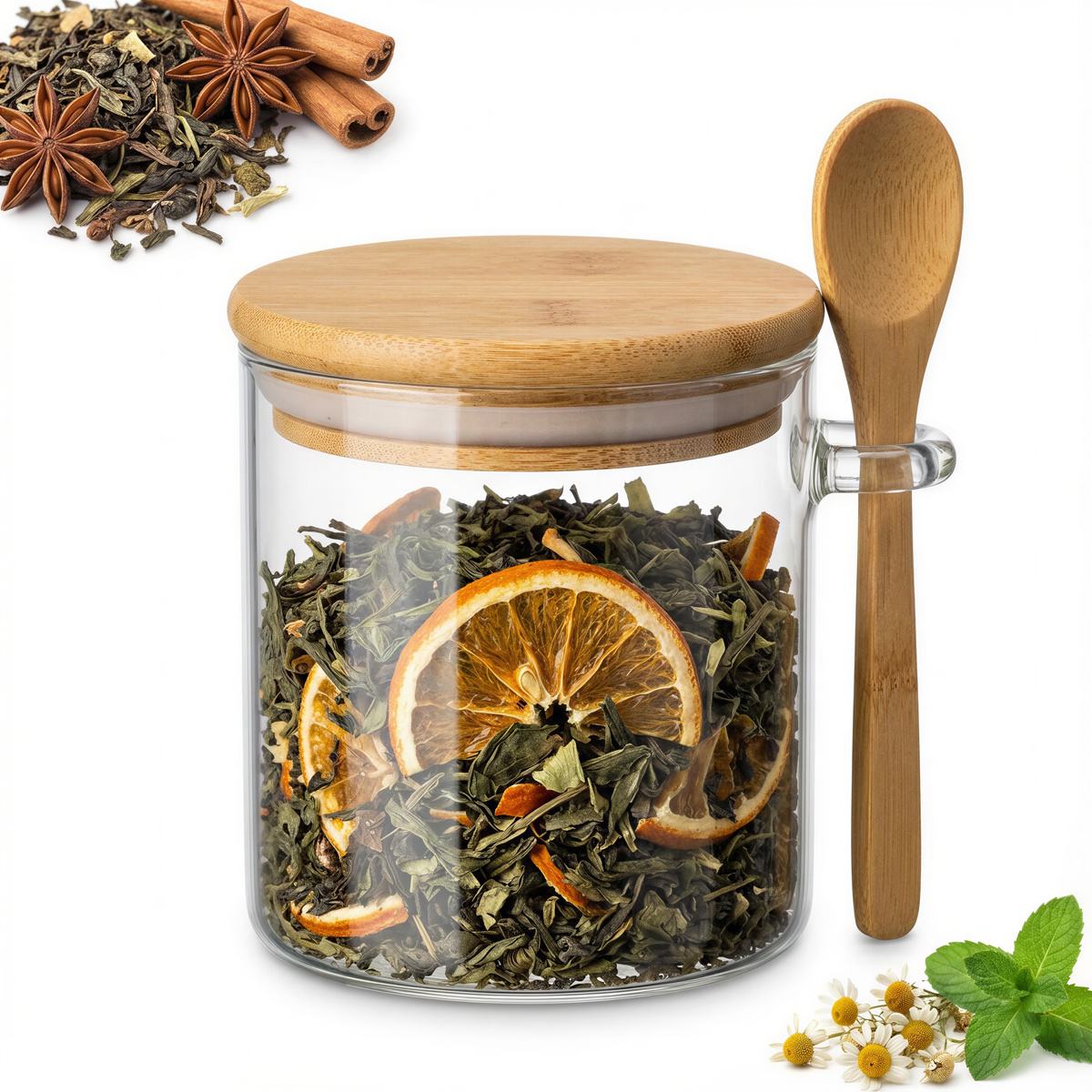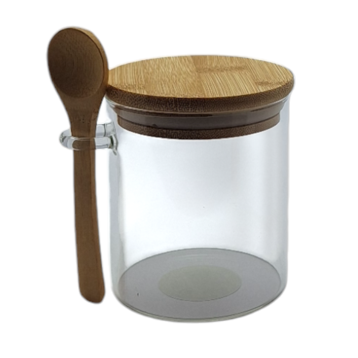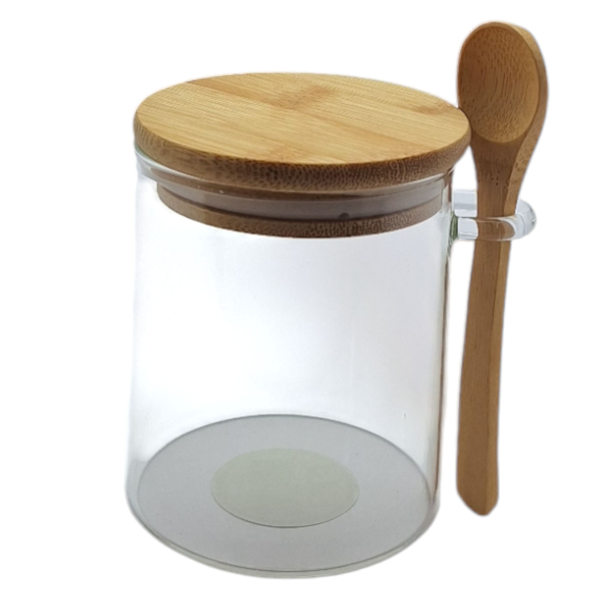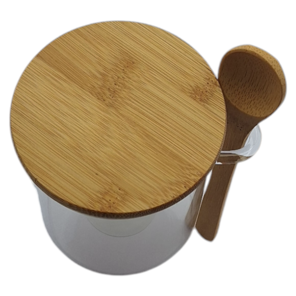 POJEMNIK SZKLANY 400 ml SŁOICZEK Z BAMBUSOWĄ POKRYWKĄ I ŁYŻECZKĄ