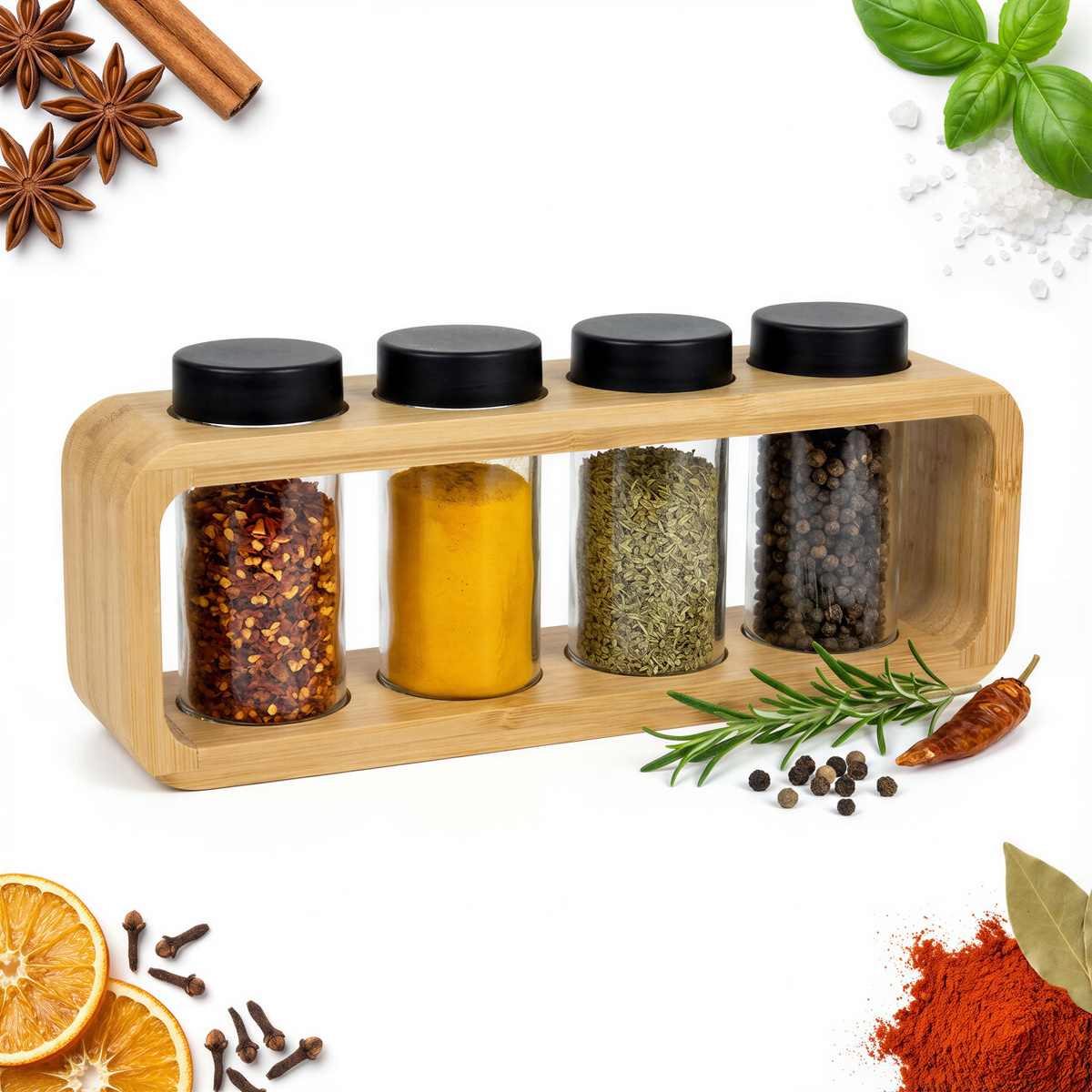 - w skład zestawu wchodzi bambusowy stojak + 4 szklane pojemniki o pojemności 75ml