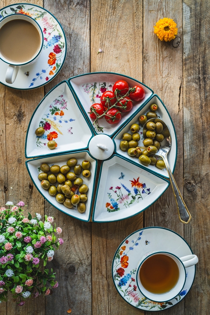 Patera ozdobiona jest zachwycającym wzorem inspirowanym letnią łąką, pełną kolorowych, intensywnych kwiatów i delikatnych motyli. Dodatkowego uroku dodaje figurka chłopca i dziewczynki umieszczona na środku patery, który zdaje się zapraszać do wspólnego delektowania się przekąskami. Ten radosny motyw wprowadzi do Twojego domu ciepłą i przyjazną atmosferę.