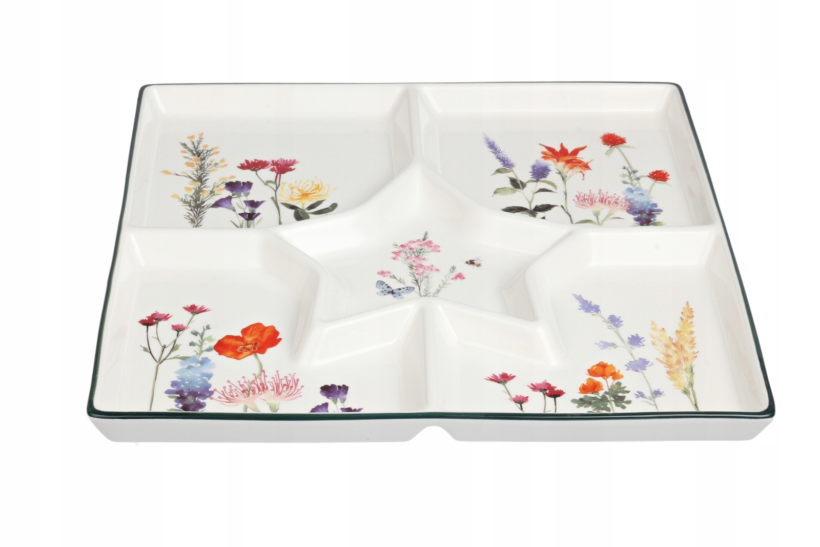która zachwyca nie tylko funkcjonalnością, ale i pięknym wzorem. Kolorowe polne kwiaty, ułożone w kształt gwiazdy w centralnej części patery, wprowadzą do Twojego domu wiosenną atmosferę i ożywią każdy stół. Subtelna, zielona lamówka dodaje paterze elegancji i podkreśla jej wyjątkowy charakter.