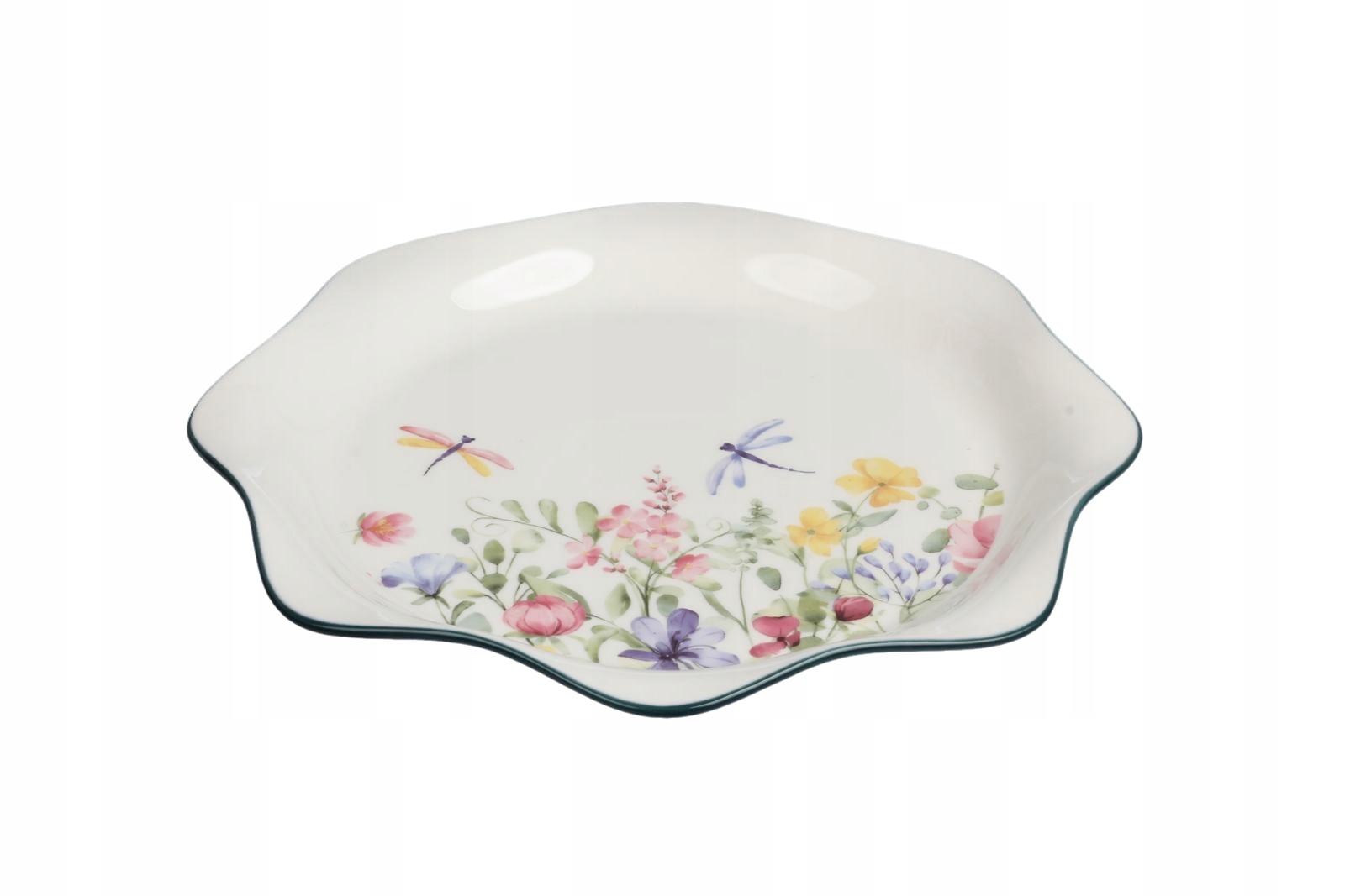 TALERZ ceramiczny 26 cm PANI KWIATEK to prawdziwa uczta dla oka. Delikatny kwiatowy wzór z kolorowymi motylami i pszczołami ożywi Twoją zastawę stołową i wprowadzi do Twojego domu odrobinę wiosenno-letniej beztroski. Falowane brzegi i subtelna, zielona lamówka dodają mu elegancji i uroku.