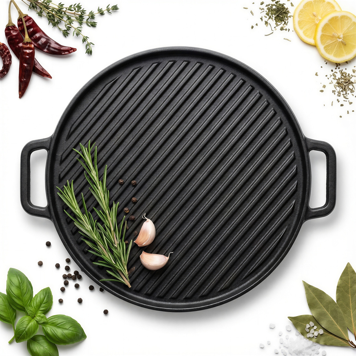 Dwustronna żeliwna patelnia płyta grillowa ruszt 30 cm ciężka i stylowa.