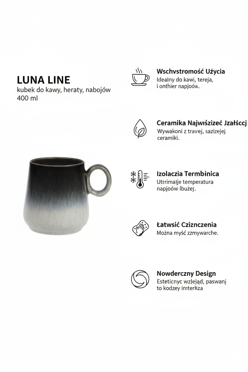 Odkryj wyjątkowy kubek LUNA LINE, który połączy elegancję z funkcjonalnością! Nasz kubek o pojemności 400 ml, wykonany z wysokiej jakości ceramiki, sprawi, że każdy łyk Twojej ulubionej kawy czy herbaty będzie niezapomnianym doznaniem.