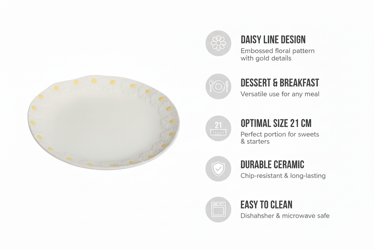 Niech każdy posiłek, od słodkiego deseru po wykwintne śniadanie, rozkwitnie w pełni dzięki wyjątkowej ceramice, która zachwyca nie tylko wyglądem, ale i jakością. Wybierz talerz DAISY LINE i ciesz się wyjątkowymi chwilami w gronie najbliższych!