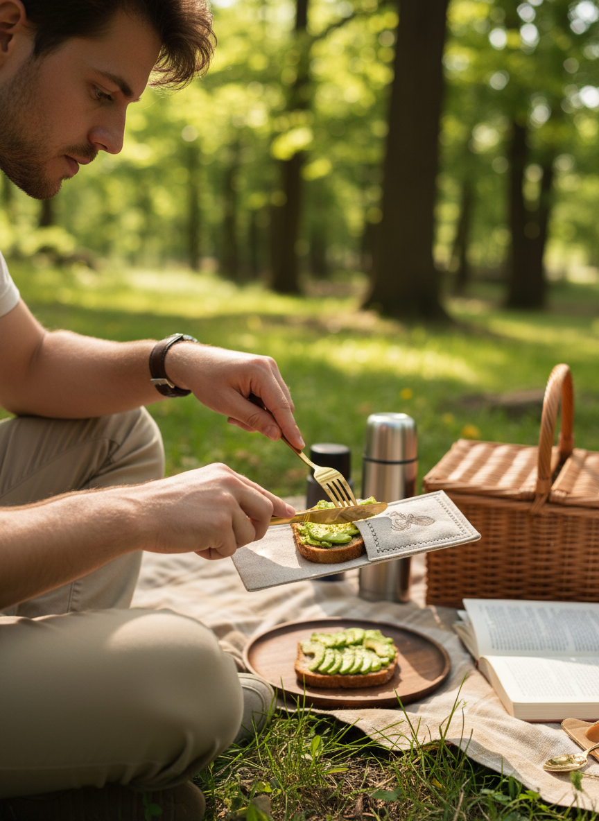 - Krok 2 — włóż sztućce do etui, aby je zabezpieczyć i estetycznie zaprezentować.