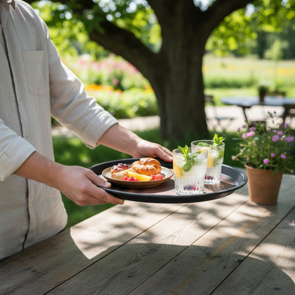 Gdy bierzesz ją do ręki, czujesz gładką fakturę, która pewnie leży w dłoni. Jej lekka waga i solidne wykonanie sprawiają, że serwowanie dań staje się prawdziwą przyjemnością. Każdy dźwięk talerzy stawianych na tacy brzmi jak muzyka, a temperatura potraw delikatnie przenika przez materiał, wywołując uczucie zadowolenia.