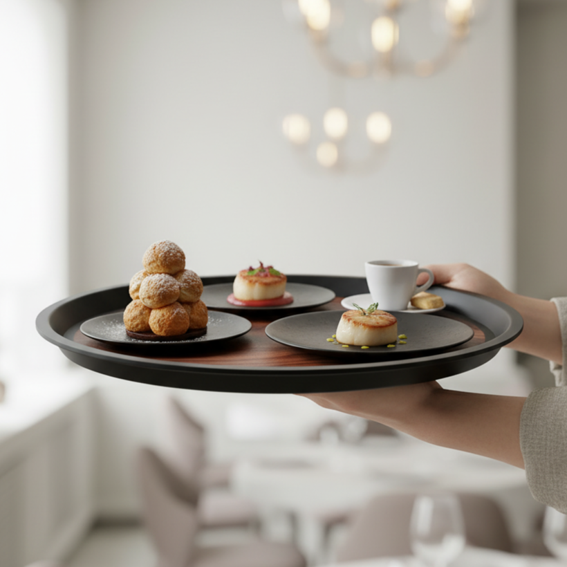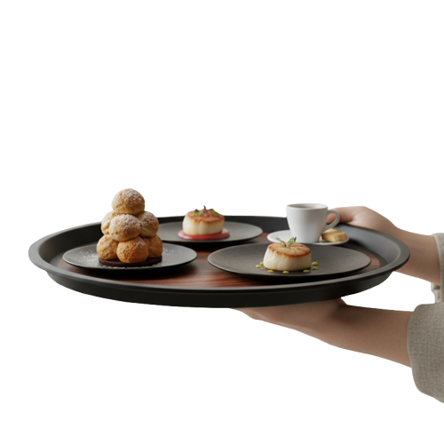Taca kelnerska do serwowania w eleganckim kolorze orzechowego brązu, idealna dla restauracji.
