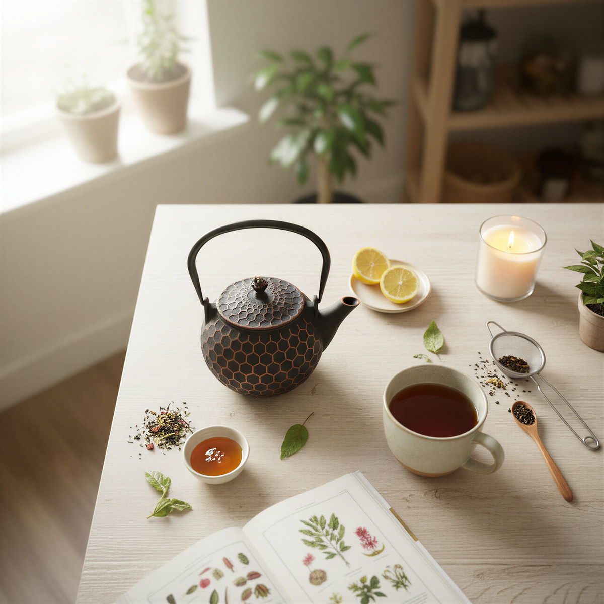 Czajnik żeliwny o pojemności 1,2 L stoi na kuchennym blacie, gotowy do działania. Wystarczy wrzucić ulubioną herbatę lub zioła, a jego elegancka forma sprawia, że staje się on centralnym punktem twojej kuchni.