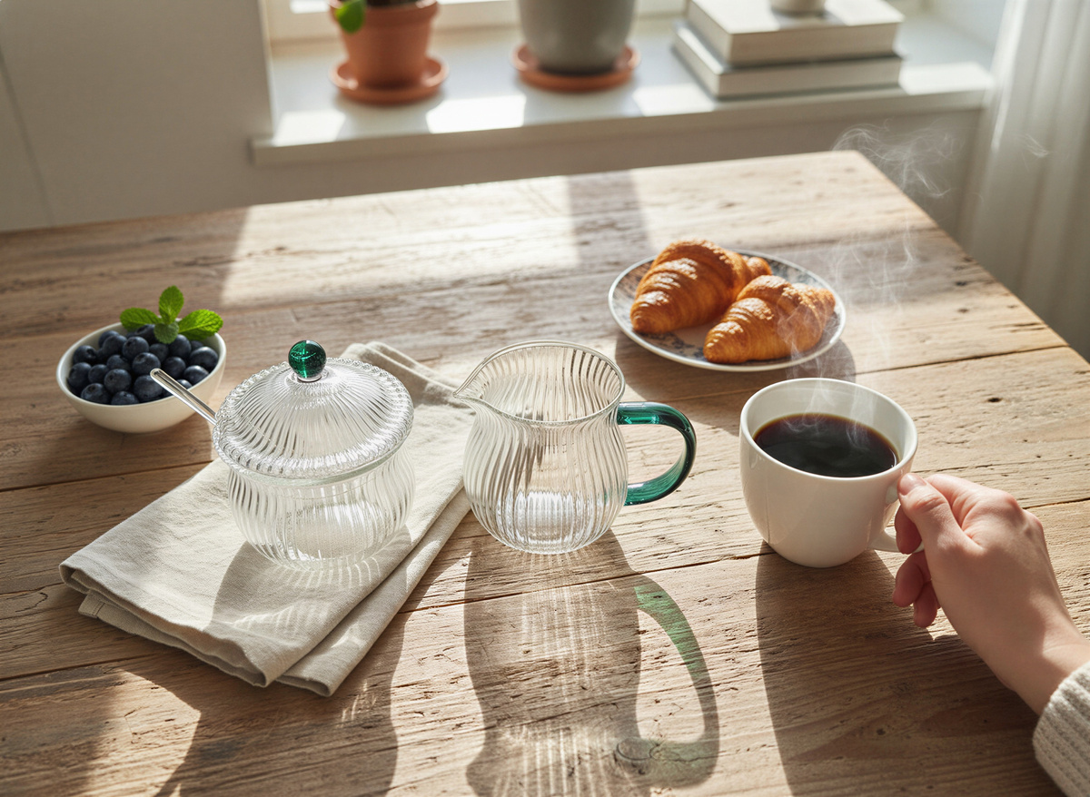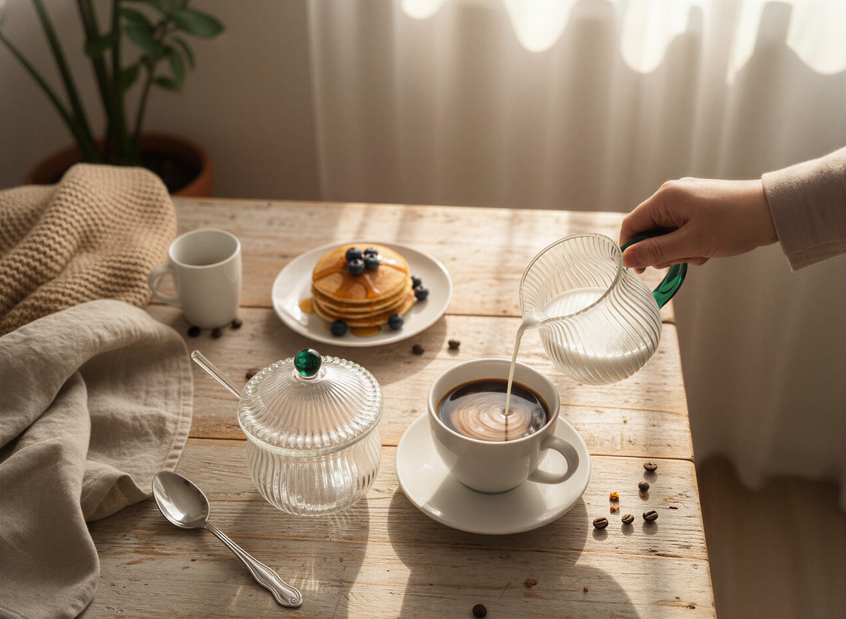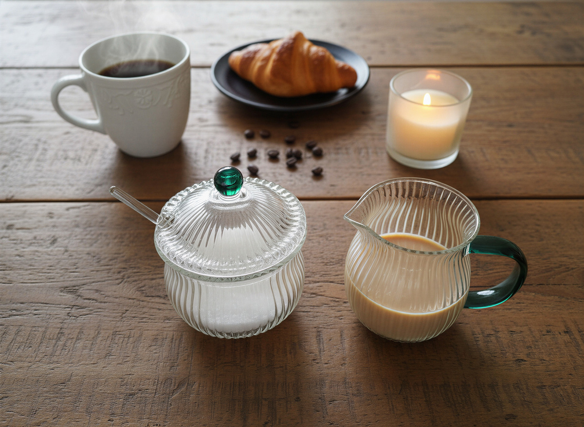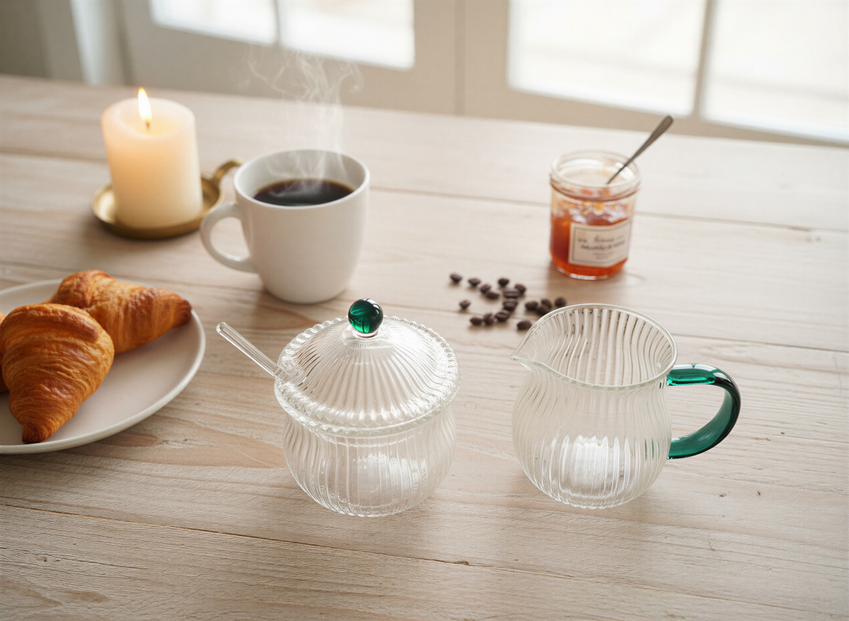 Wtedy pojawia się w Twojej kuchni zestaw cukiernica z mlecznikiem w prążki o pojemności 250 ml — idealny do serwowania kawy i herbaty. Dzięki niemu każde podanie mleka i cukru staje się prostsze i piękniejsze. Przezroczyste szkło i praktyczne elementy idealnie wchodzą w rytm Twojego dnia, dodając mu harmonię i elegancję.