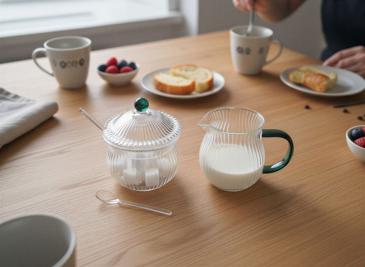 Zestaw cukiernica z mlecznikiem w prążki do serwowania z przezroczystego szkła, łatwy w utrzymaniu czystości i odporny na zmywanie w zmywarce.