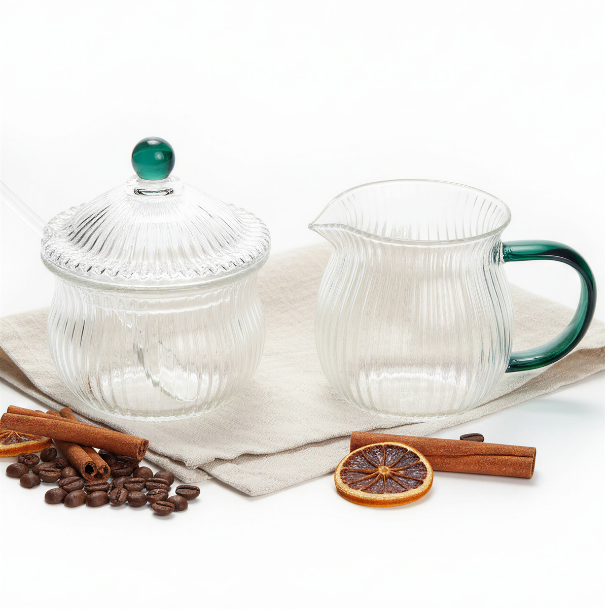 • ✅ ☀️ ELEGANCJA I STYLE – Przezroczysty zestaw z falistymi żłobieniami i ciemnozieloną gałką wnosi klasę do każdego wnętrza, nadając wyjątkowy wygląd podczas serwowania kawy lub herbaty.