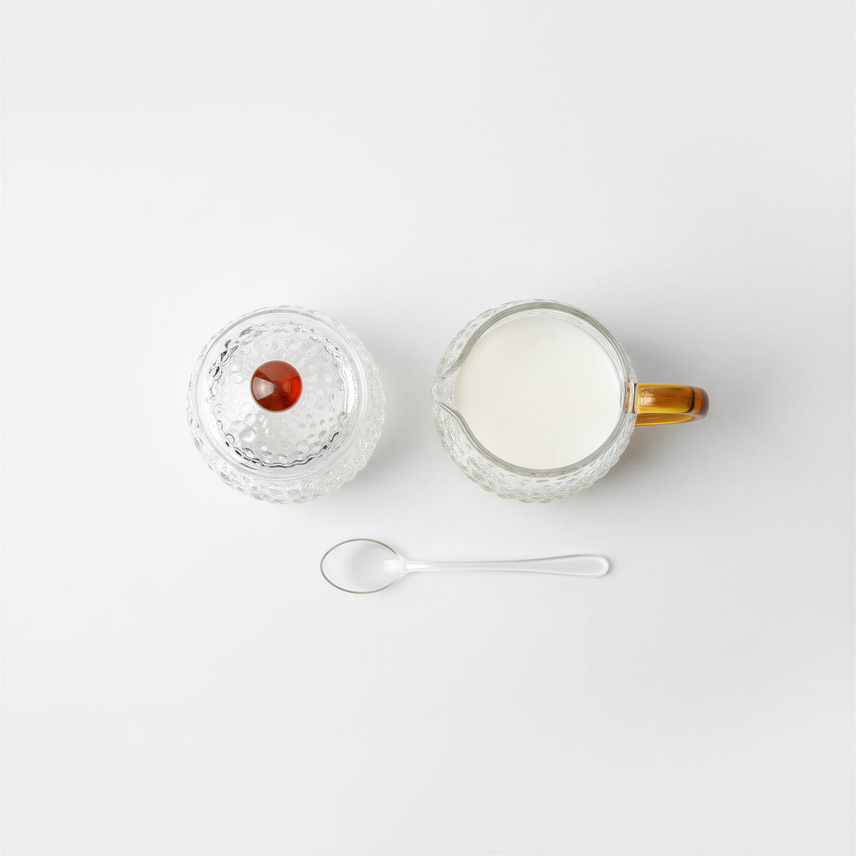 Wtedy do akcji wkracza przezroczysty zestaw do serwowania — cukiernica, mlecznik i szklana łyżeczka. Delikatnie wprowadza harmonię do Twojego dnia, pozwalając podać ulubione napoje i dodatki w eleganckim stylu. Wszystko idealnie komponuje się zarówno na porannym stole, jak i podczas spotkań z bliskimi.