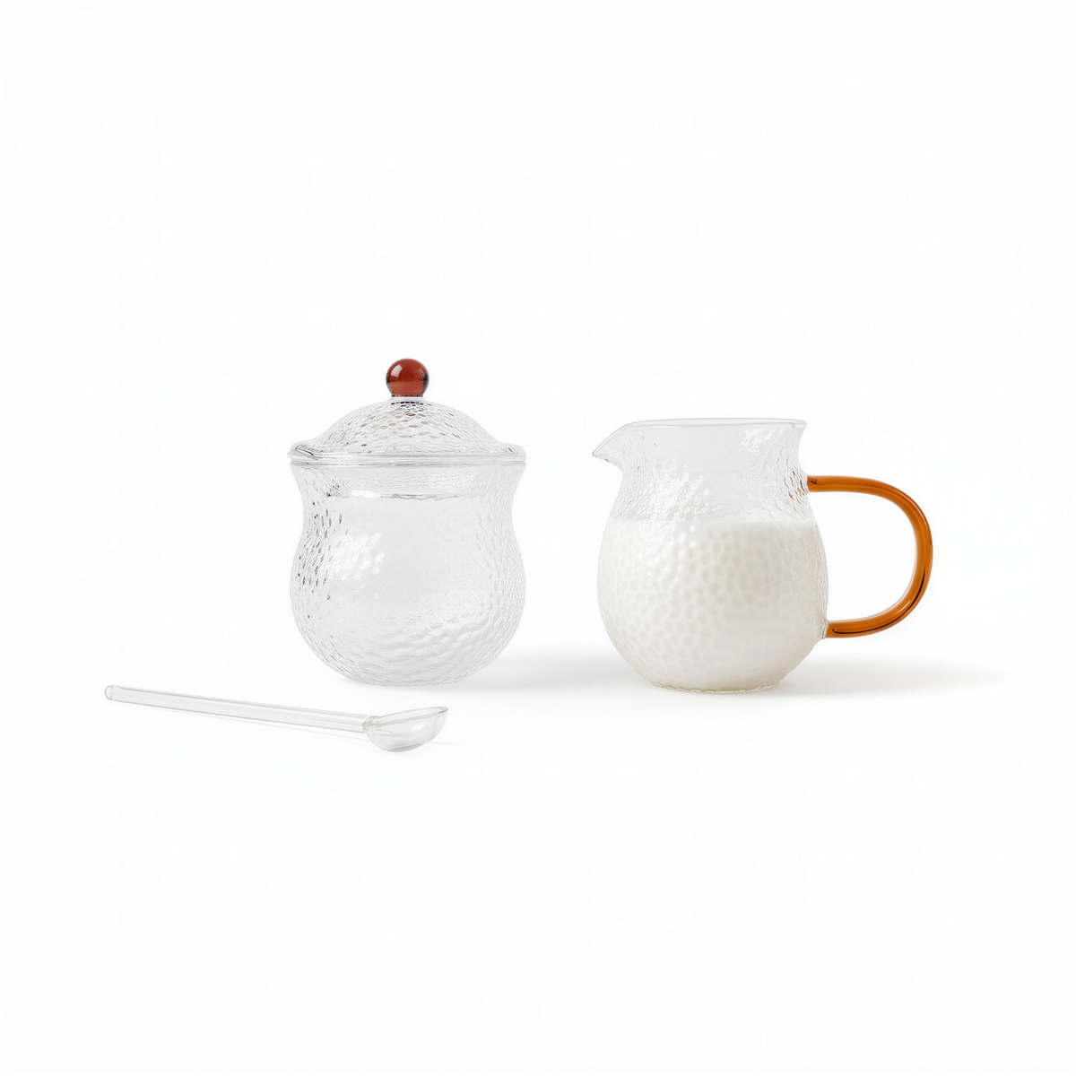 Dotyk szkła borokrzemowego o strukturze młotkowej to połączenie chłodu i gładkości, które przyjemnie zaskakuje zmysły. Subtelny bursztynowy uchwyt mlecznika nadaje całości unikalnego, ciepłego blasku. Każde nalanie mleka czy wsypanie cukru staje się niemal rytuałem pełnym harmonii i estetycznej przyjemności ☀️.
