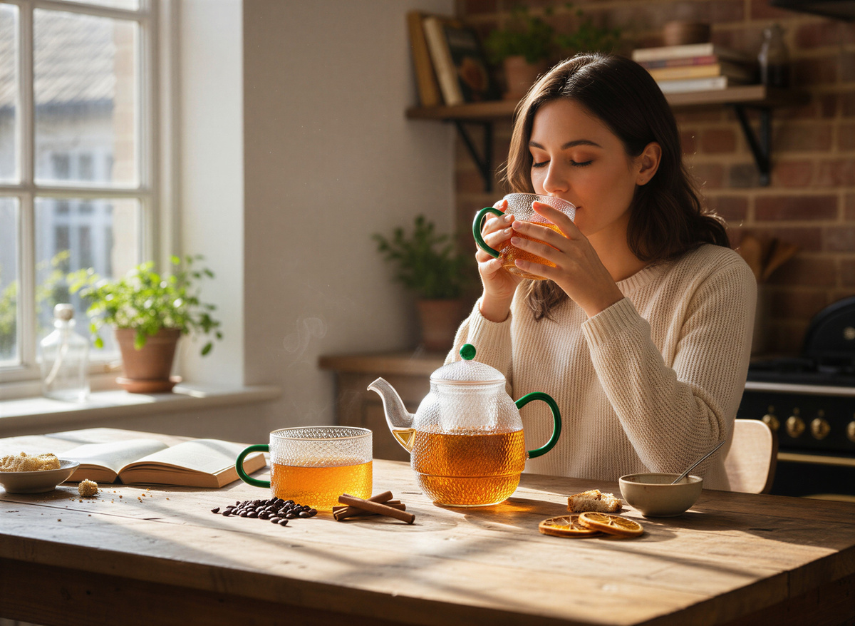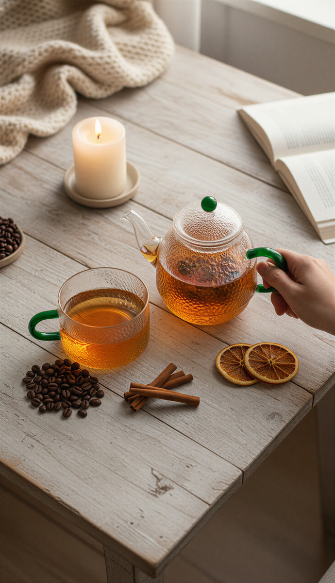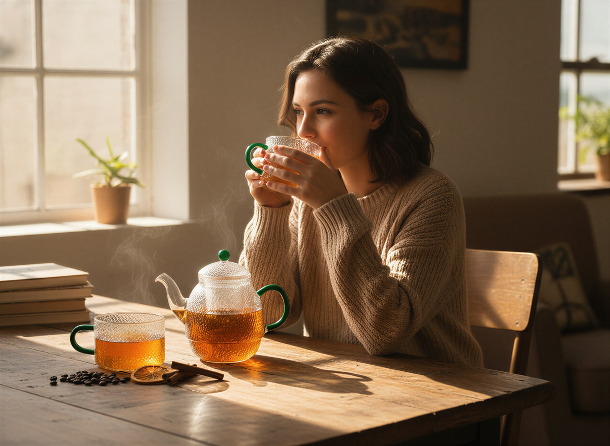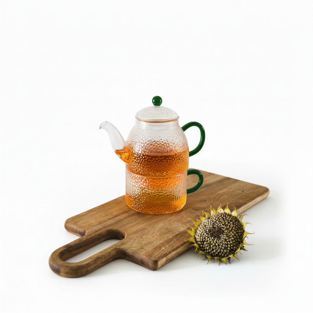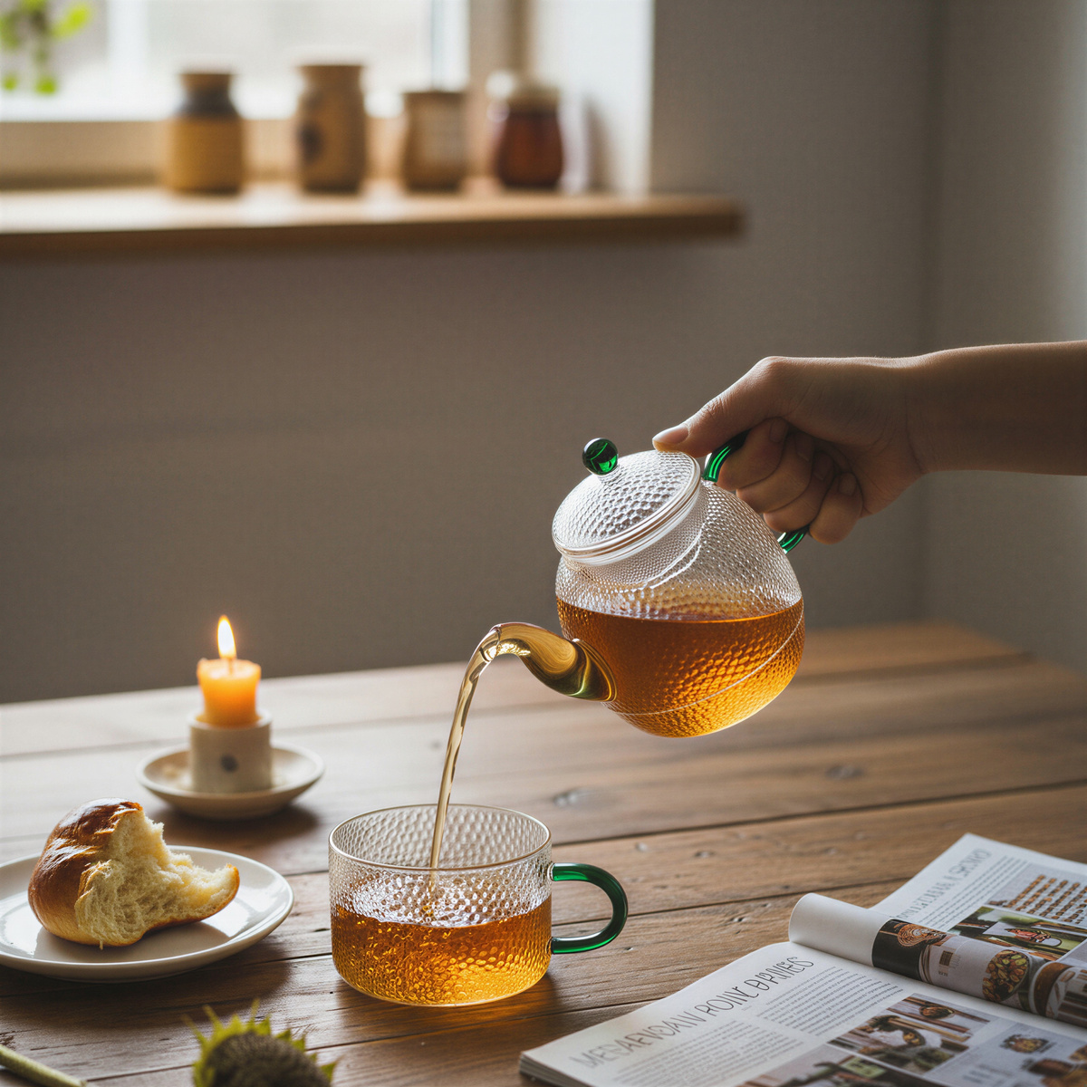Dotykasz trwałego szkła borokrzemowego, które lekko grzeje dłoń, a przez bursztynową barwę widzisz, jak napar mieni się niczym złote światło popołudniowego słońca. Subtelny dźwięk nalewania, delikatny aromat ulubionych liści i szklana struktura tworzą zmysłową harmonię, która koi i inspiruje ☕.