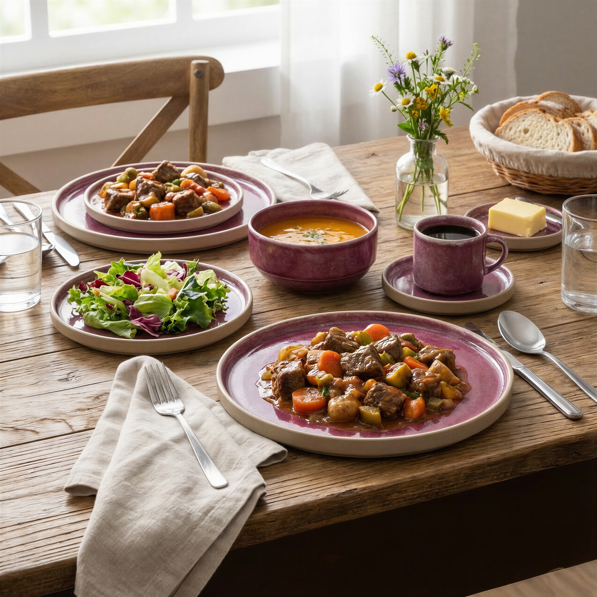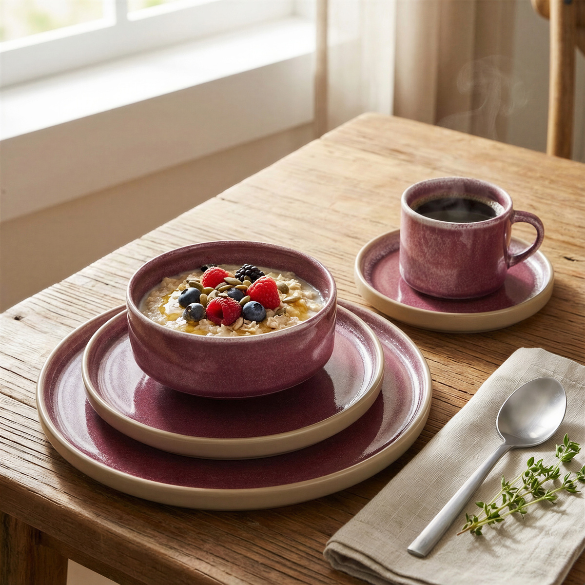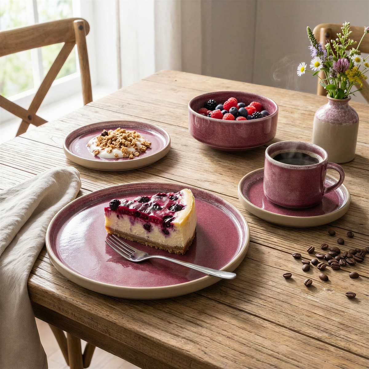 Delikatna faktura szkliwionej ceramiki w połączeniu z ciepłym, śliwkowym odcieniem otula zmysły. Każdy talerz i miska o wyważonych wymiarach to nie tylko piękno na stole, ale i miękka, satynowa powierzchnia, która w dotyku daje poczucie komfortu. Ten zestaw niemal szeleści spokojem, zapraszając do długich rozmów przy stole ☀️.
