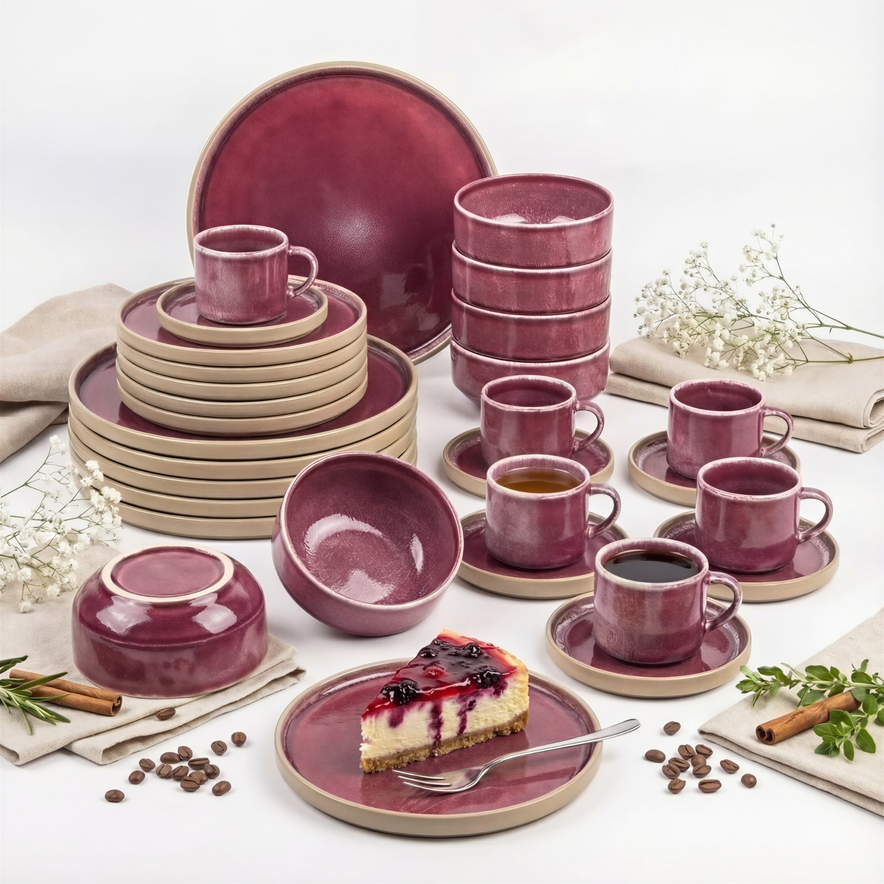 SERWIS OBIADOWYO KAWOWY 30 EL. DLA 6 OSÓB FILIŻANKI DO KAWY FIOLET CERAMIKA