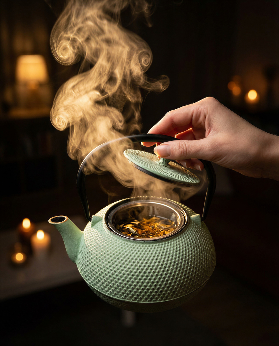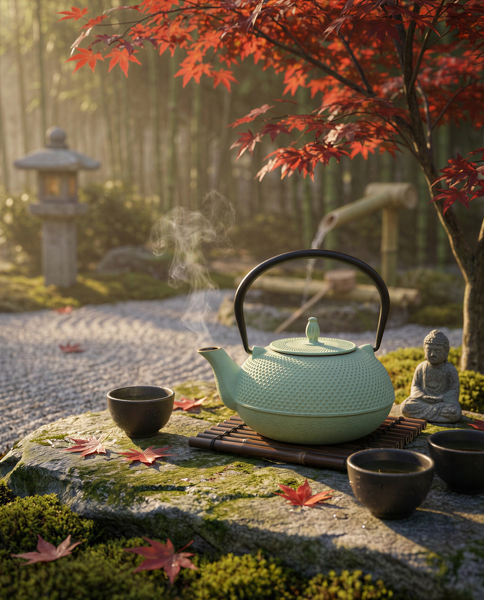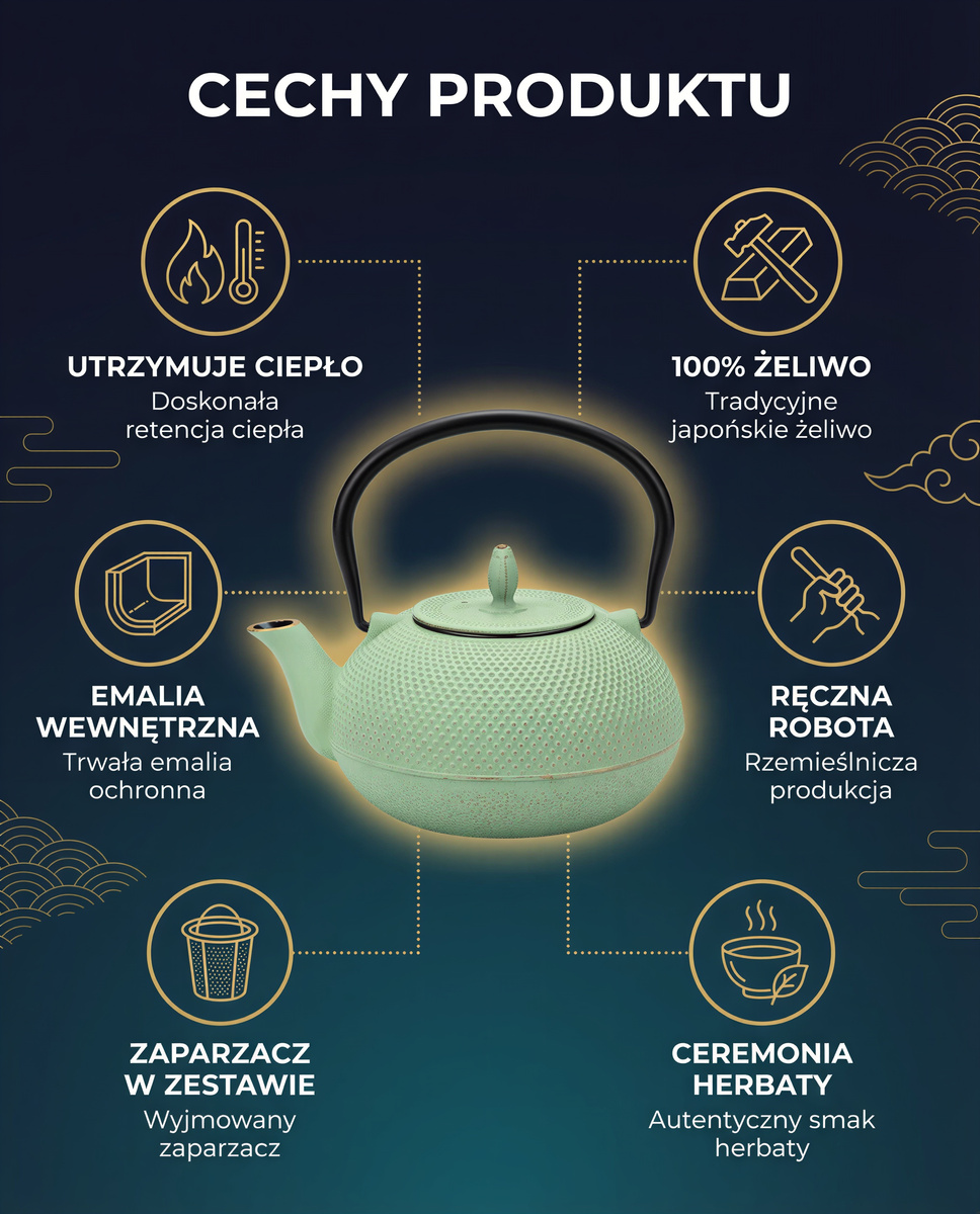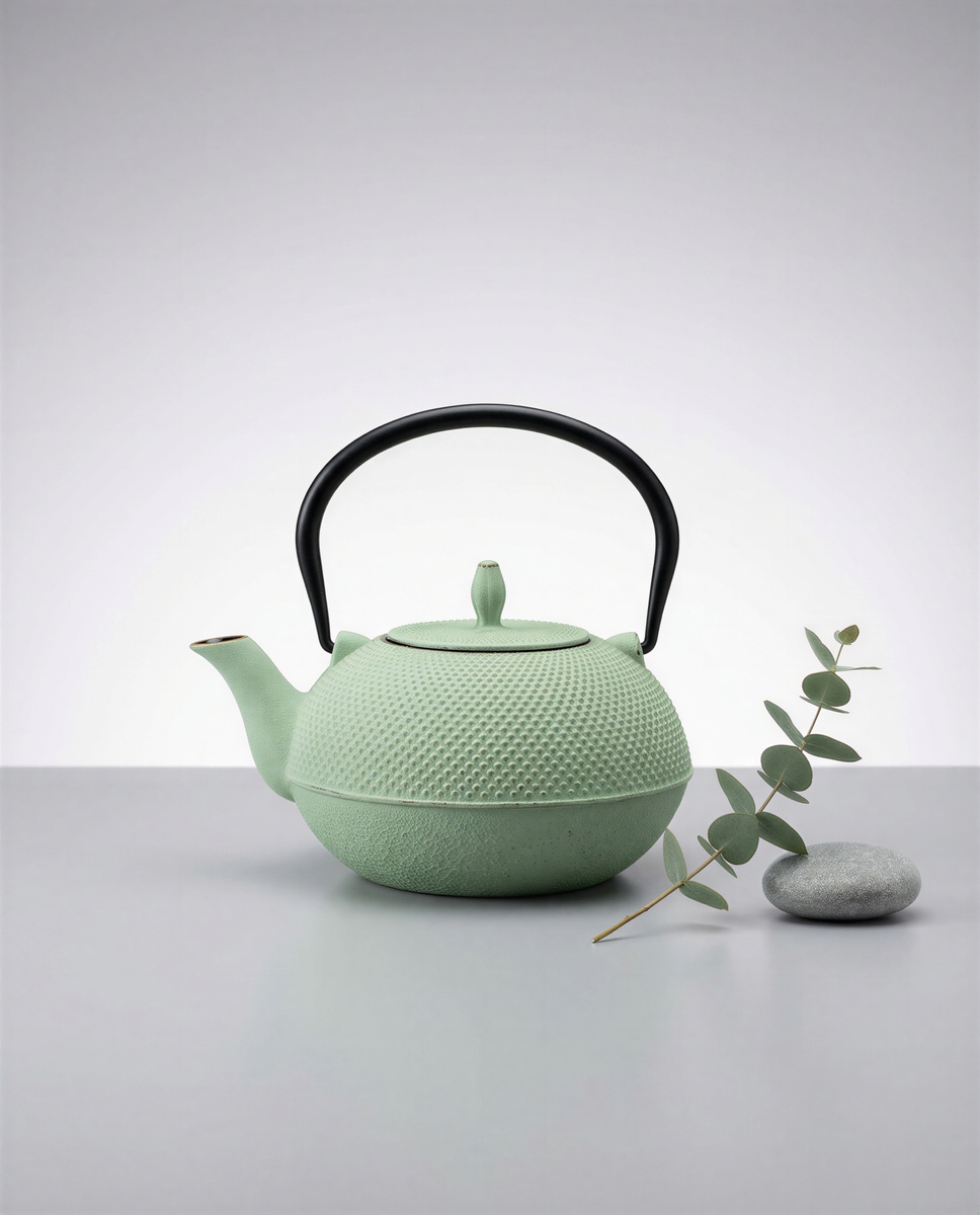 Dotyk zimnego żeliwa, który stopniowo ogrzewa się pod wpływem gorącej wody, szmer delikatnie bulgoczącej herbaty w stalowym zaparzaczu, a także subtelność miętowego odcienia to zasmak prawdziwego relaksu. Każde zanurzenie zapachu liści, każdy łyk, staje się chwilą pełną spokoju i harmonii dla zmysłów.