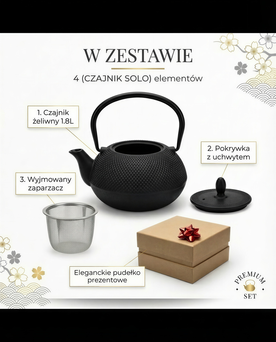 - Liczba elementów: Imbryk żeliwny, elegancki kartonik