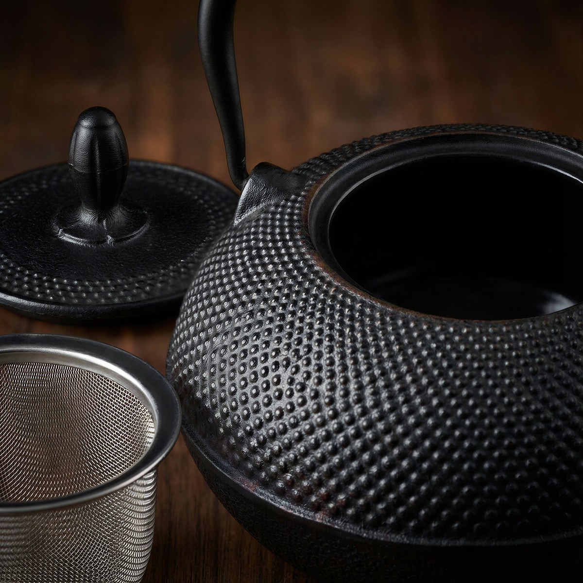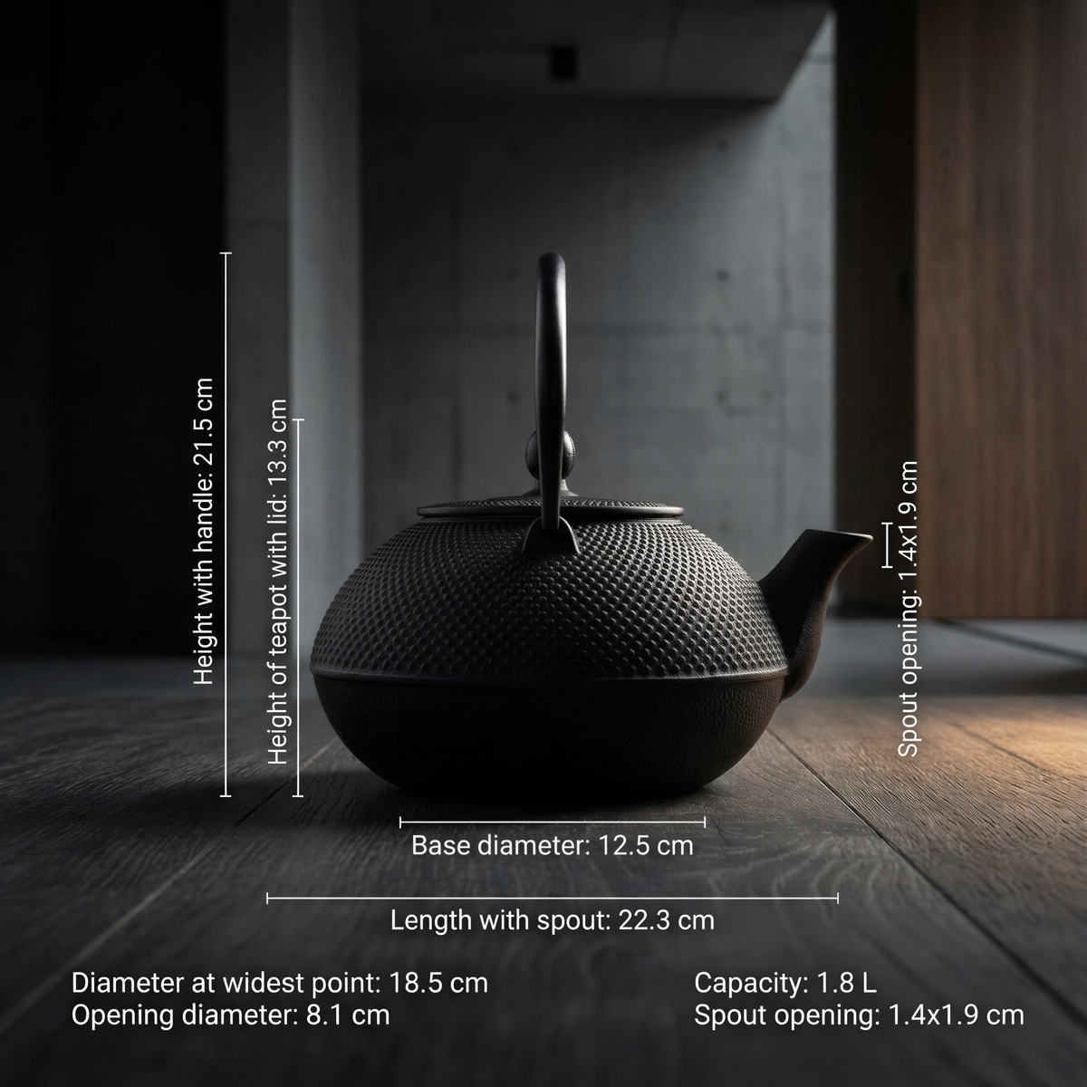Wkracza wtedy żeliwny imbrzyk o pojemności 1,8 L w głębokim czarnym kolorze, zaprojektowany specjalnie do herbaty. Z aparatem ze stali nierdzewnej pozwala Ci zanurzyć się w rytuale parzenia, a solidna konstrukcja zapewnia trwałość i praktyczność każdego dnia.