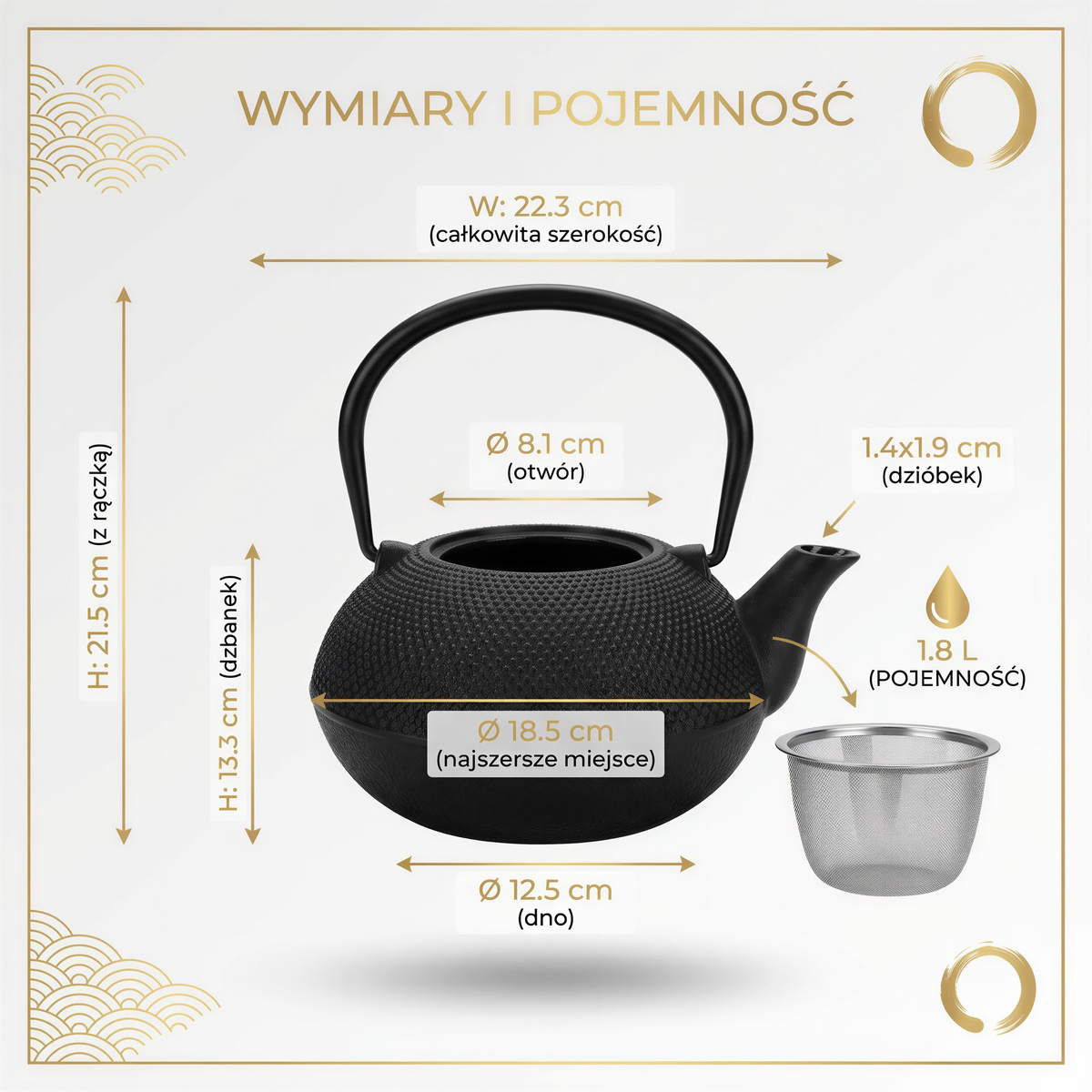 - ✅ ? IDEALNA POJEMNOŚĆ – dzięki 1.8L pojemności przygotujesz więcej ulubionej herbaty jednorazowo, a żeliwny materiał utrzymuje ciepło dłużej, co gwarantuje dłuższy relaks.