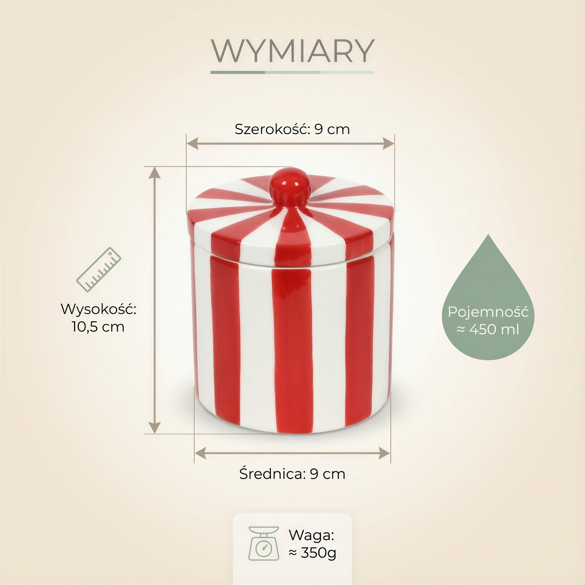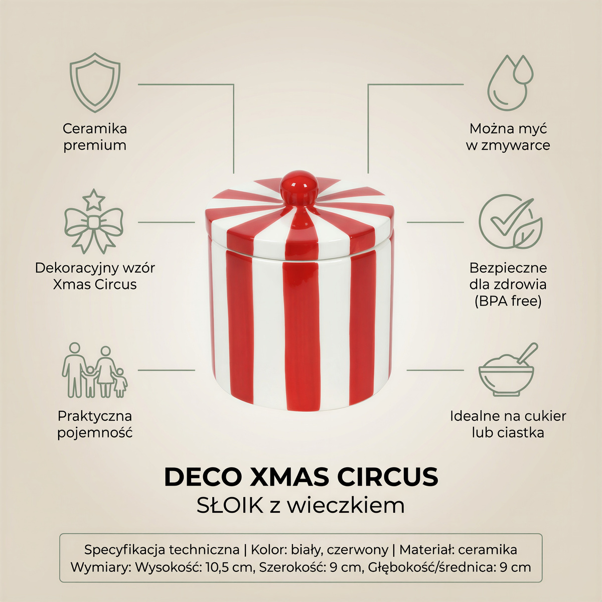 Ciesz się świąteczną atmosferą i zadbaj o porządek dzięki 1 elementowi dekoracyjnemu – DECO XMAS CIRCUS SŁOIK z wieczkiem/cukiernica DO PRZECHOWYWANIA w kolorach białym i czerwonym. Ten pięknie wykonany z ceramiki słoik o wymiarach 10,5 cm wysokości oraz 9x9 cm szerokości i głębokości jest idealny, by przechowywać Twoje ulubione przysmaki i jednocześnie zdobić wnętrze.