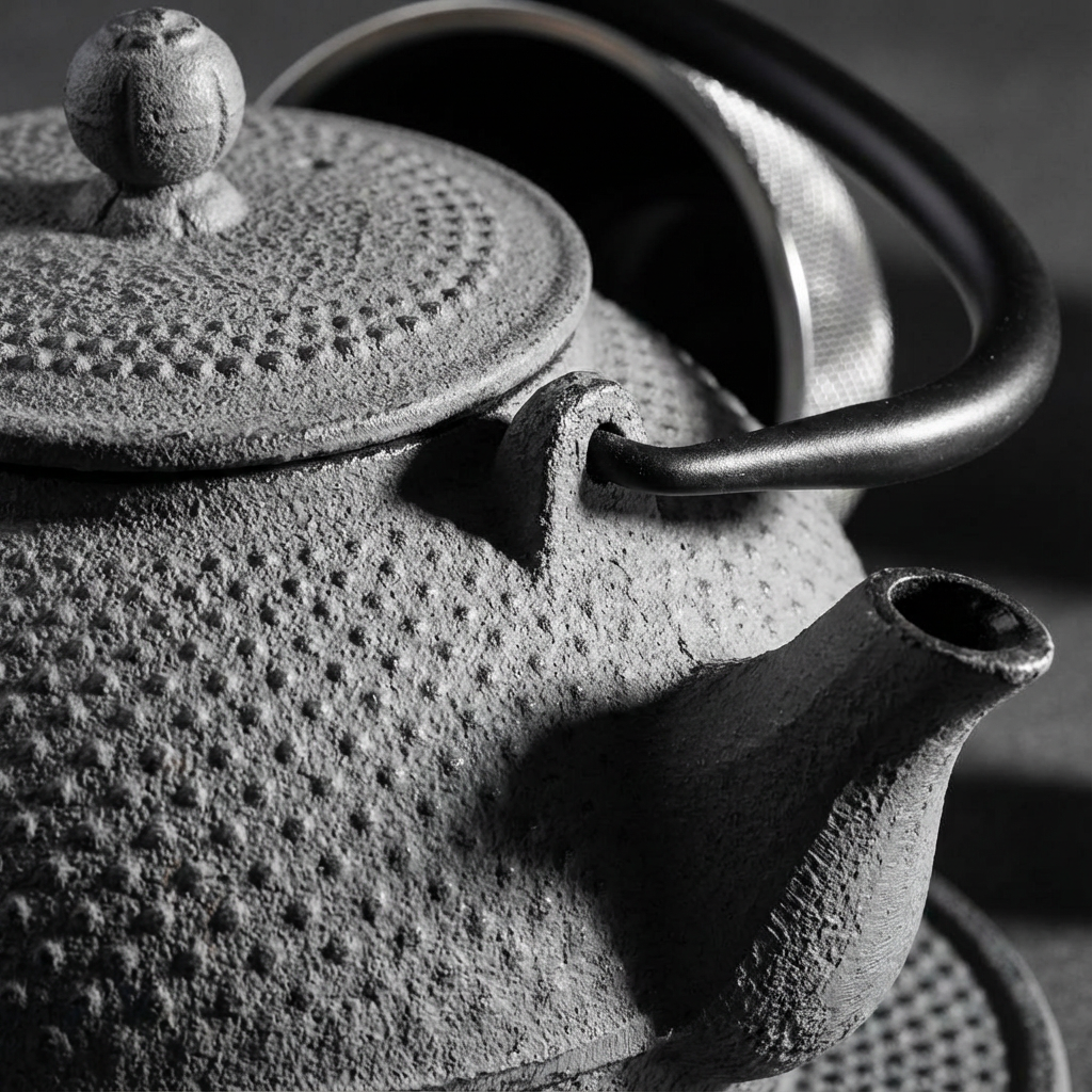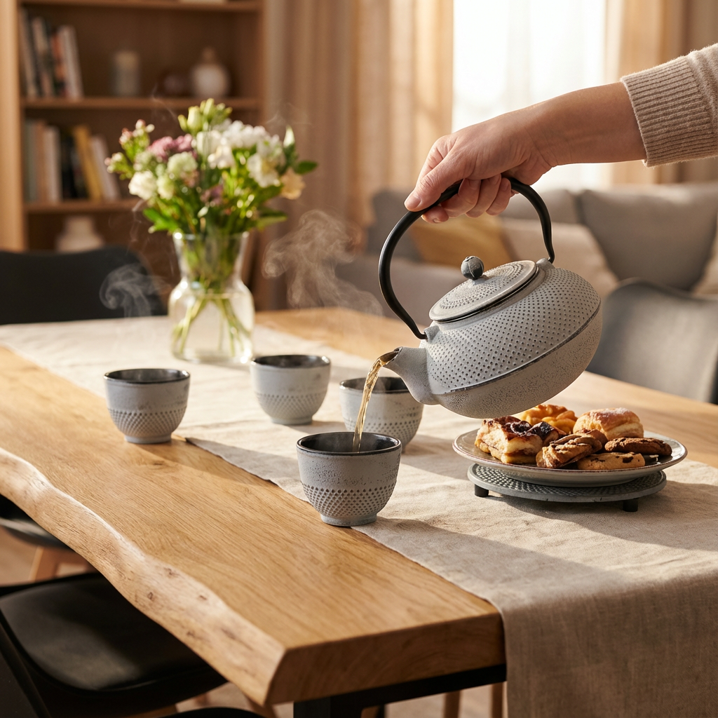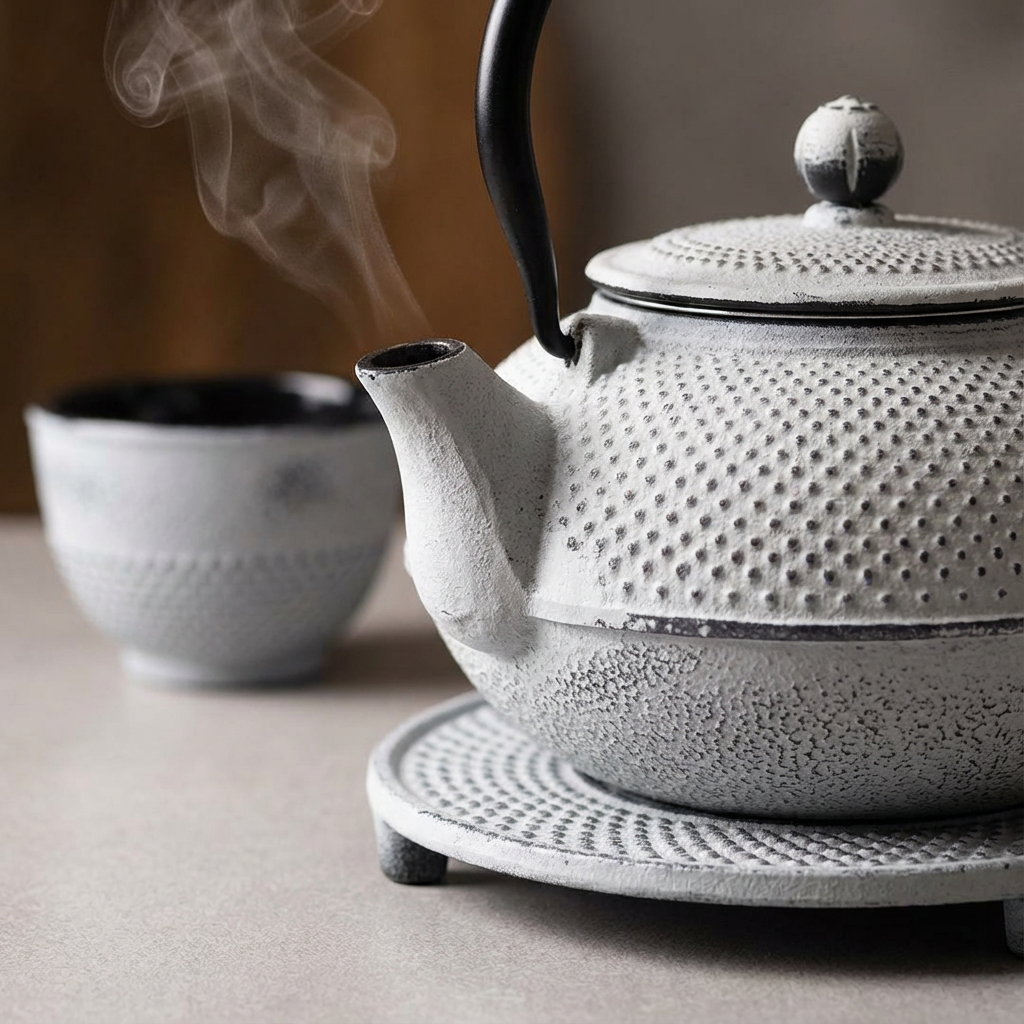Kiedy nalewasz herbatę, czujesz **ciepło żeliwa i delikatny szum pary**, a aromat ulatnia się powoli, wypełniając kuchnię kuszącymi nutami. Powierzchnia czajnika emanuje surową elegancją, a **chłodny szary kolor** wspaniale kontrastuje z gorącym napojem, który dłużej zatrzymuje ciepło niż zwykłe naczynia.