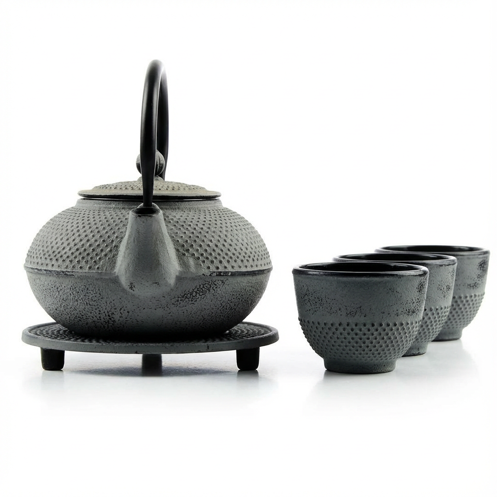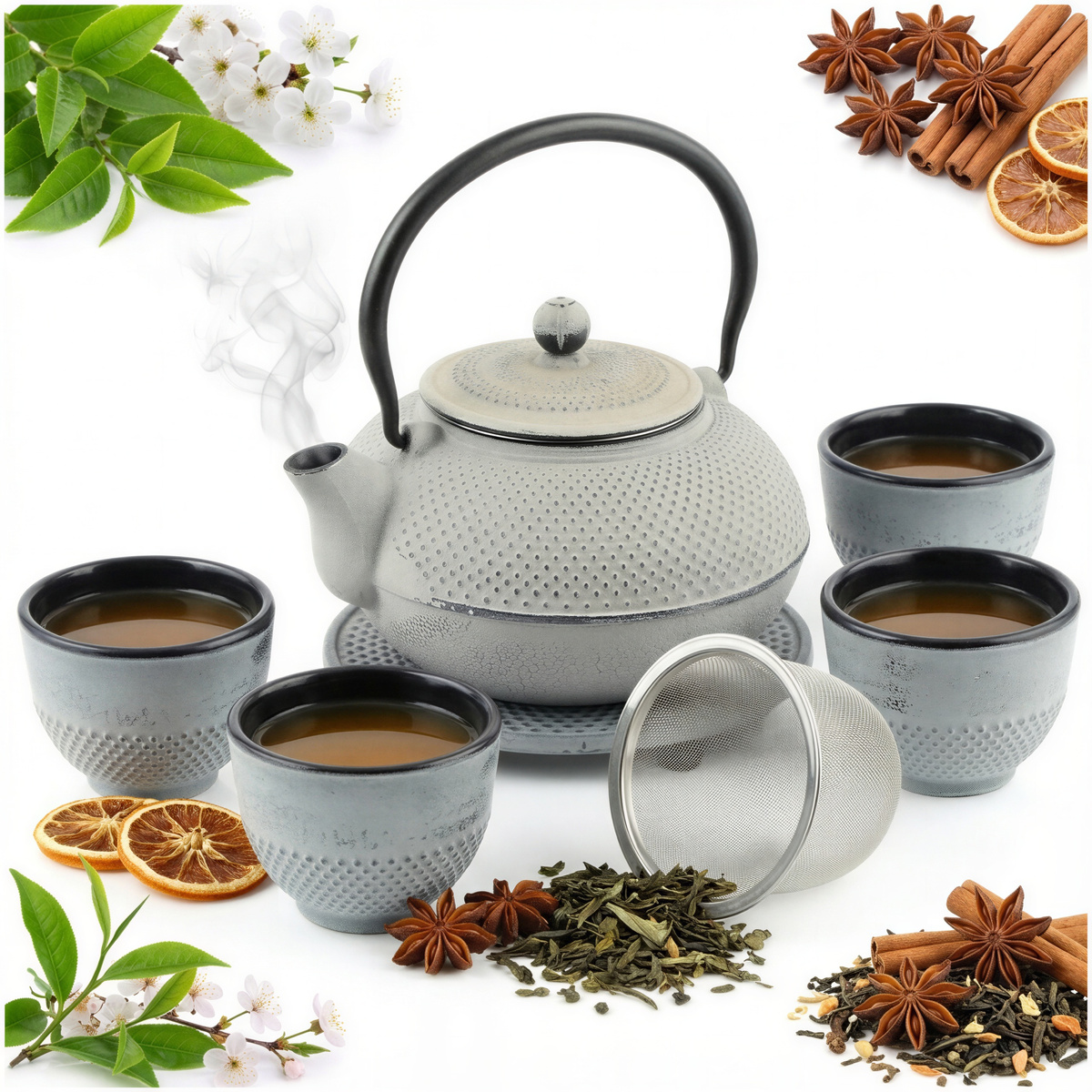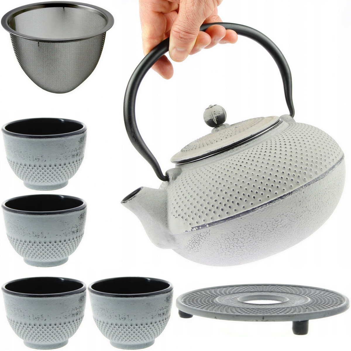 Zestaw do herbaty obejmuje żeliwny czajnik z zaparzaczem oraz 4 czarki i podkładkę, które zapewniają trwałość i długotrwałe utrzymanie ciepła.