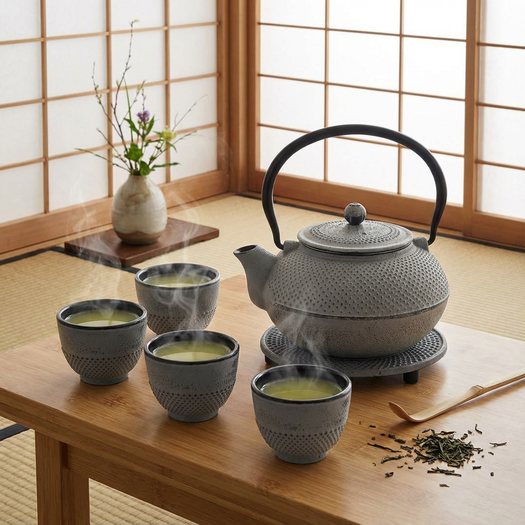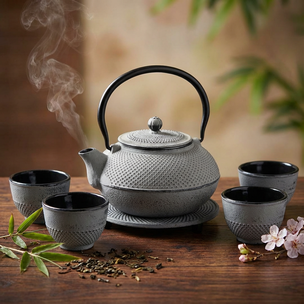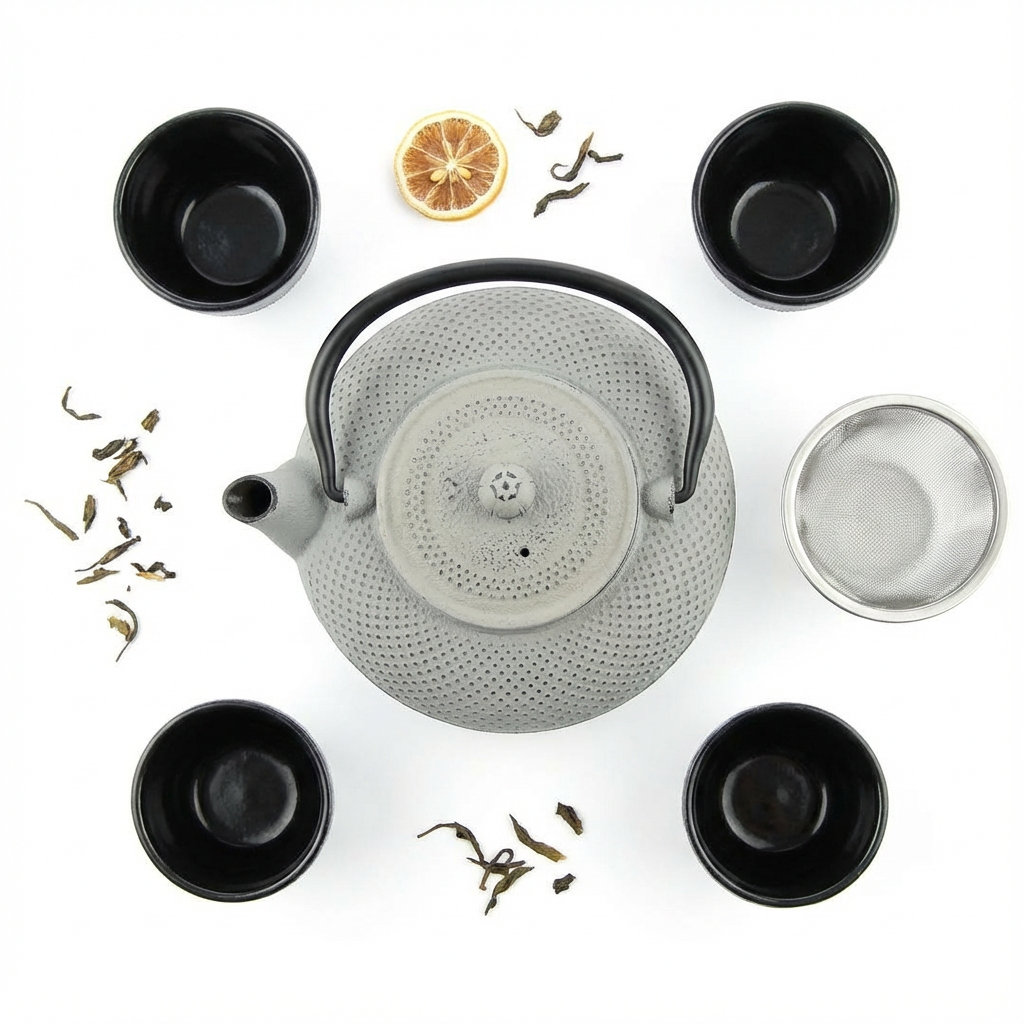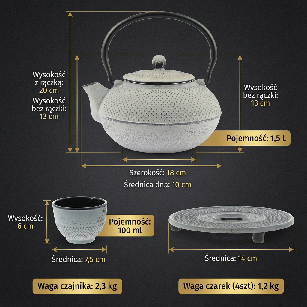 Zestaw do herbaty obejmuje żeliwny czajnik z zaparzaczem oraz 4 czarki i podkładkę, które zapewniają trwałość i długotrwałe utrzymanie ciepła.