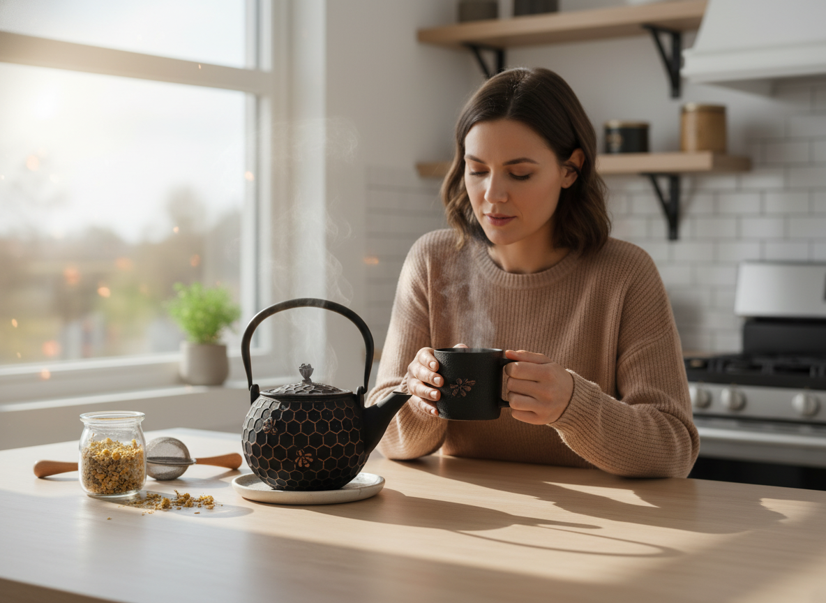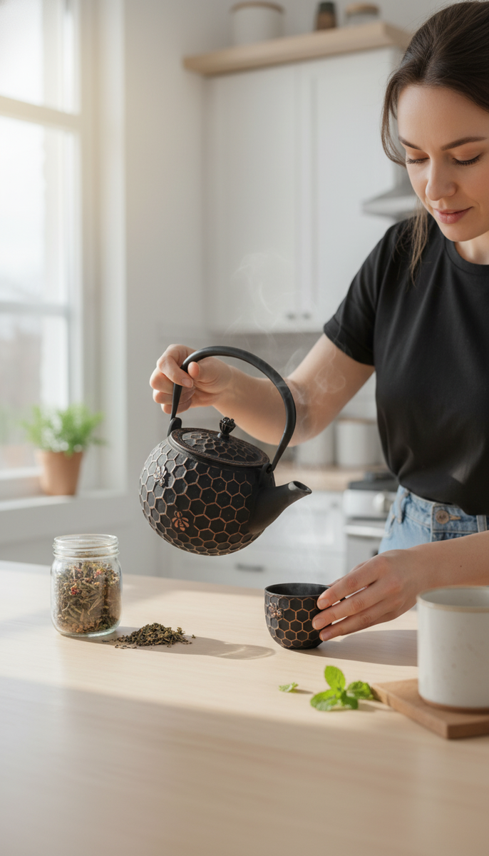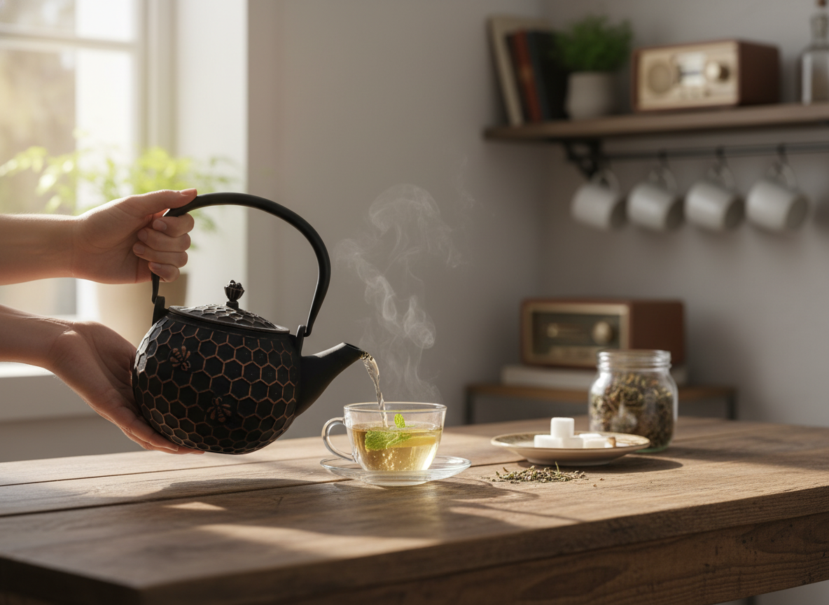 Gdy wlewasz wodę do czajnika, słychać cichutkie bulgotanie, które uspokaja zmysły. Faktura żeliwa sprawia, że czajnik jest nie tylko estetyczny, ale także idealnie trzyma ciepło, a unoszący się zapach parzonej herbaty otula Cię przyjemnym ciepłem, wypełniając dom radosną atmosferą.