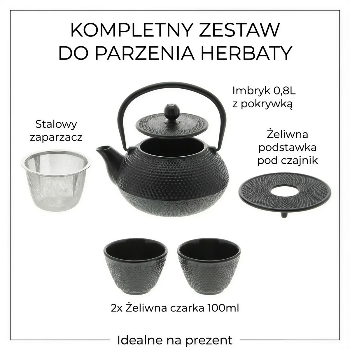 • Produkt: Czajnik żeliwny 0,8 L imbrek zaparzacz do herbaty i ziół +2 czarki podkładka