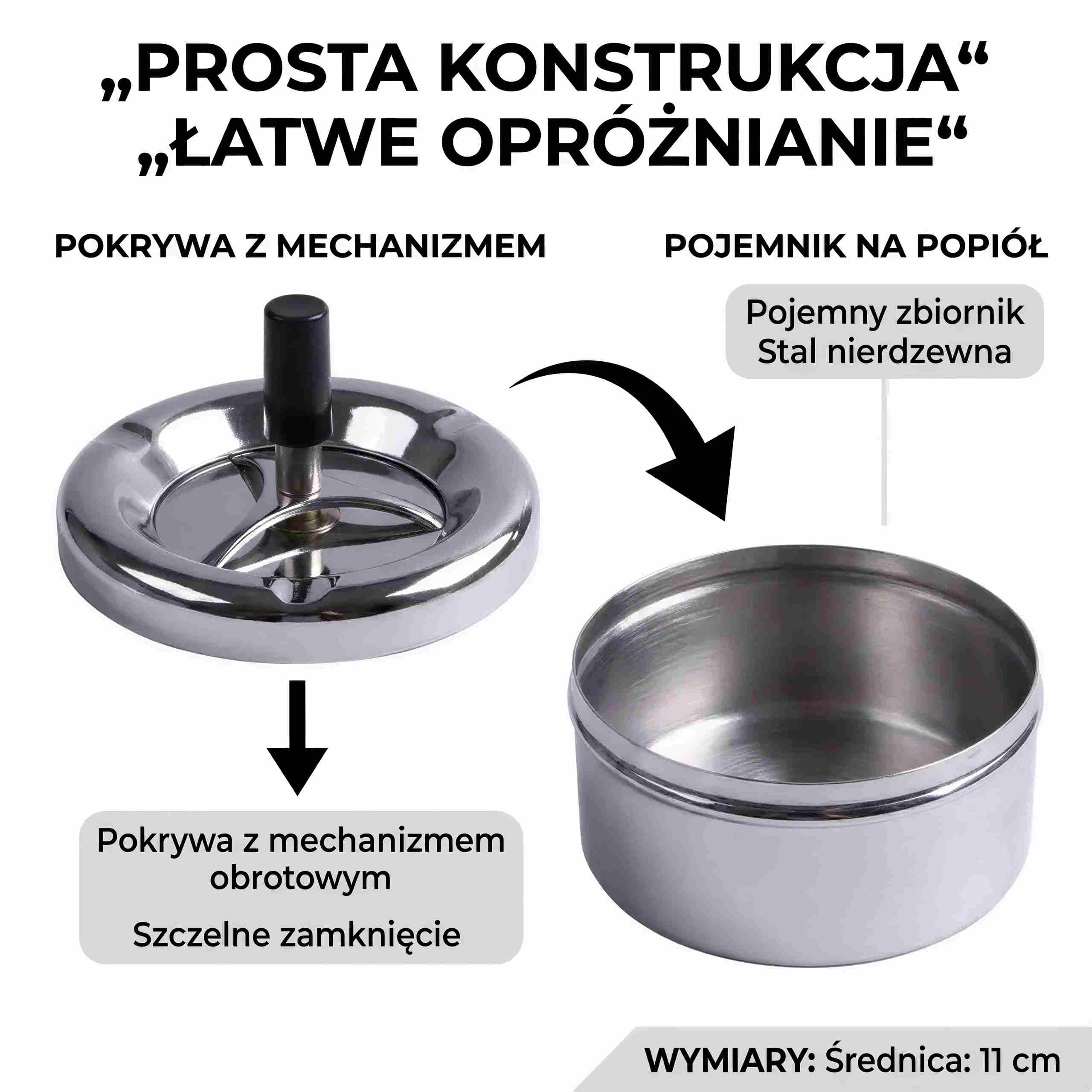 - ✅ Zamykany mechanizm obrotowy – skutecznie zabezpiecza przed rozsypaniem popiołu, co utrzymuje porządek w Twoim otoczeniu.