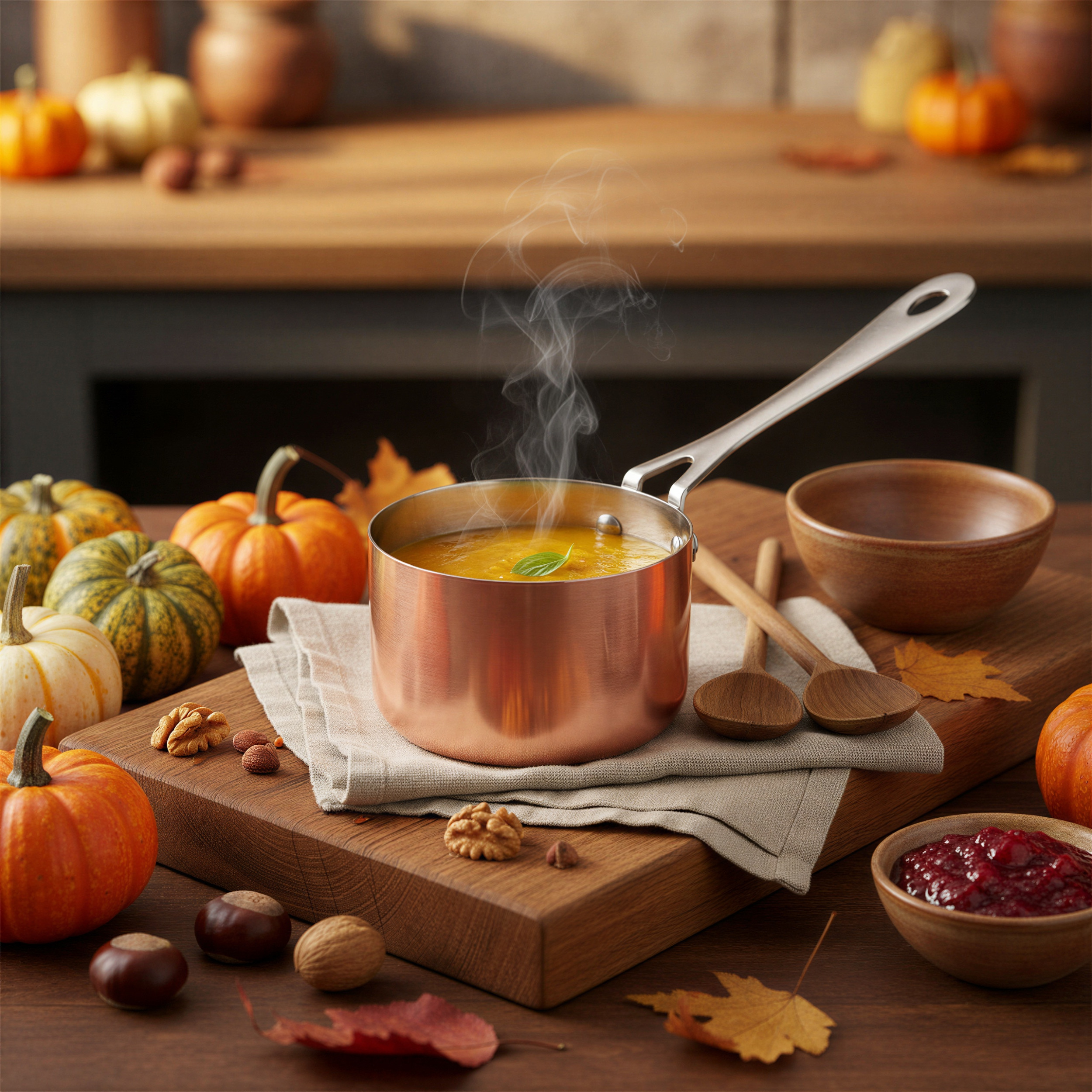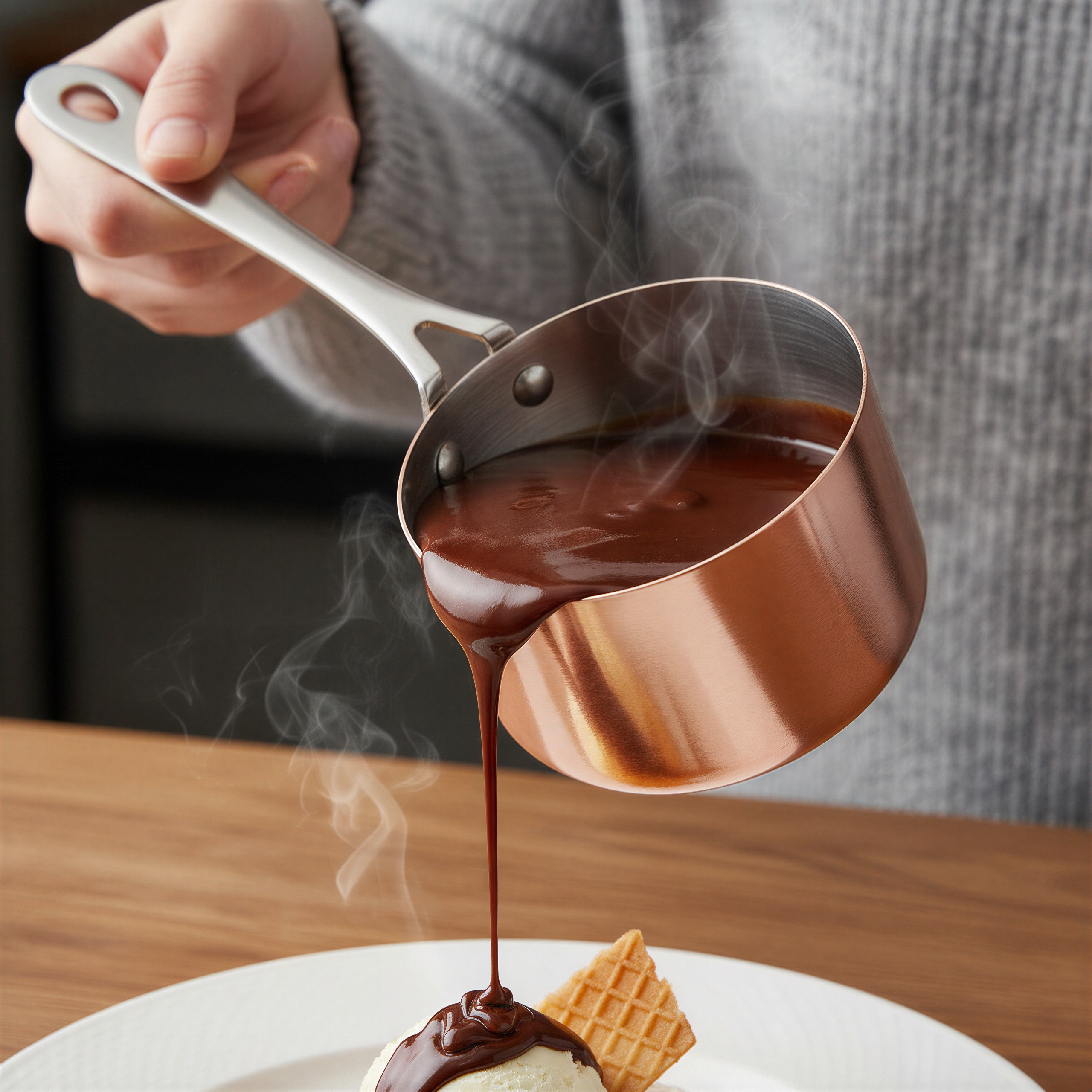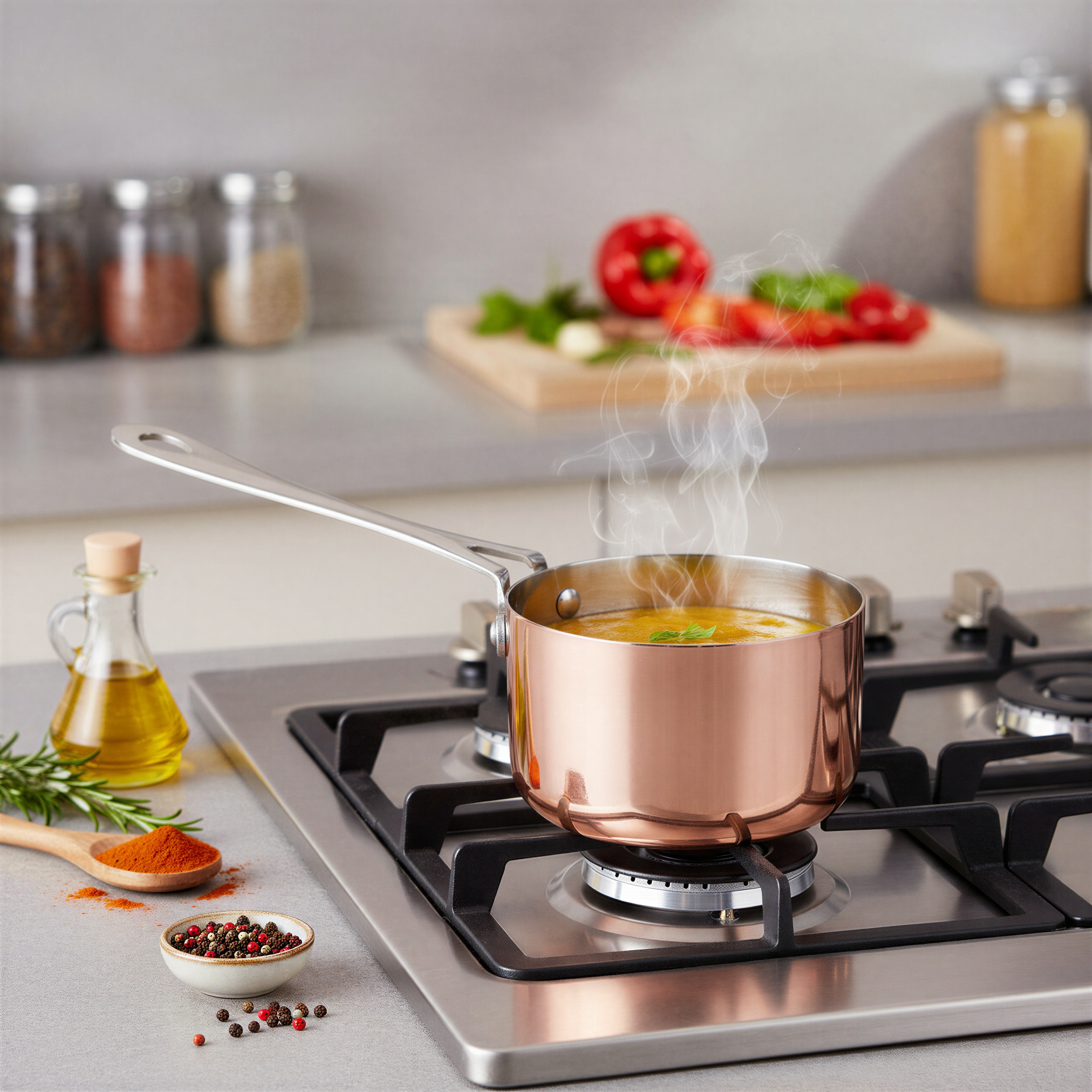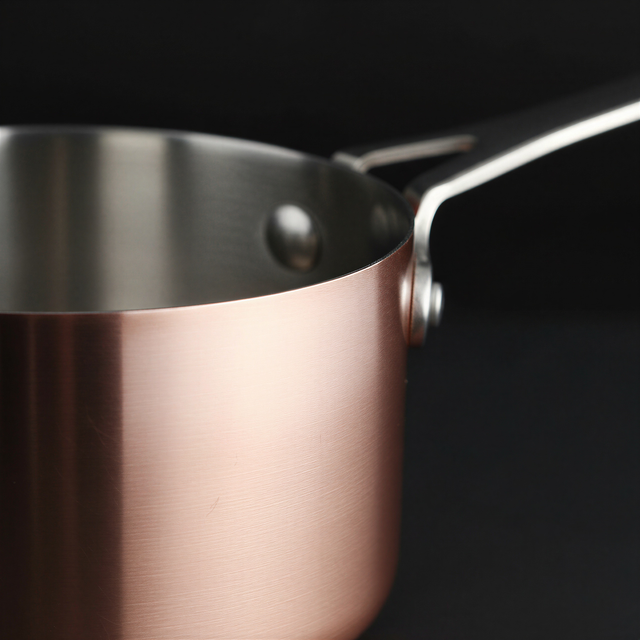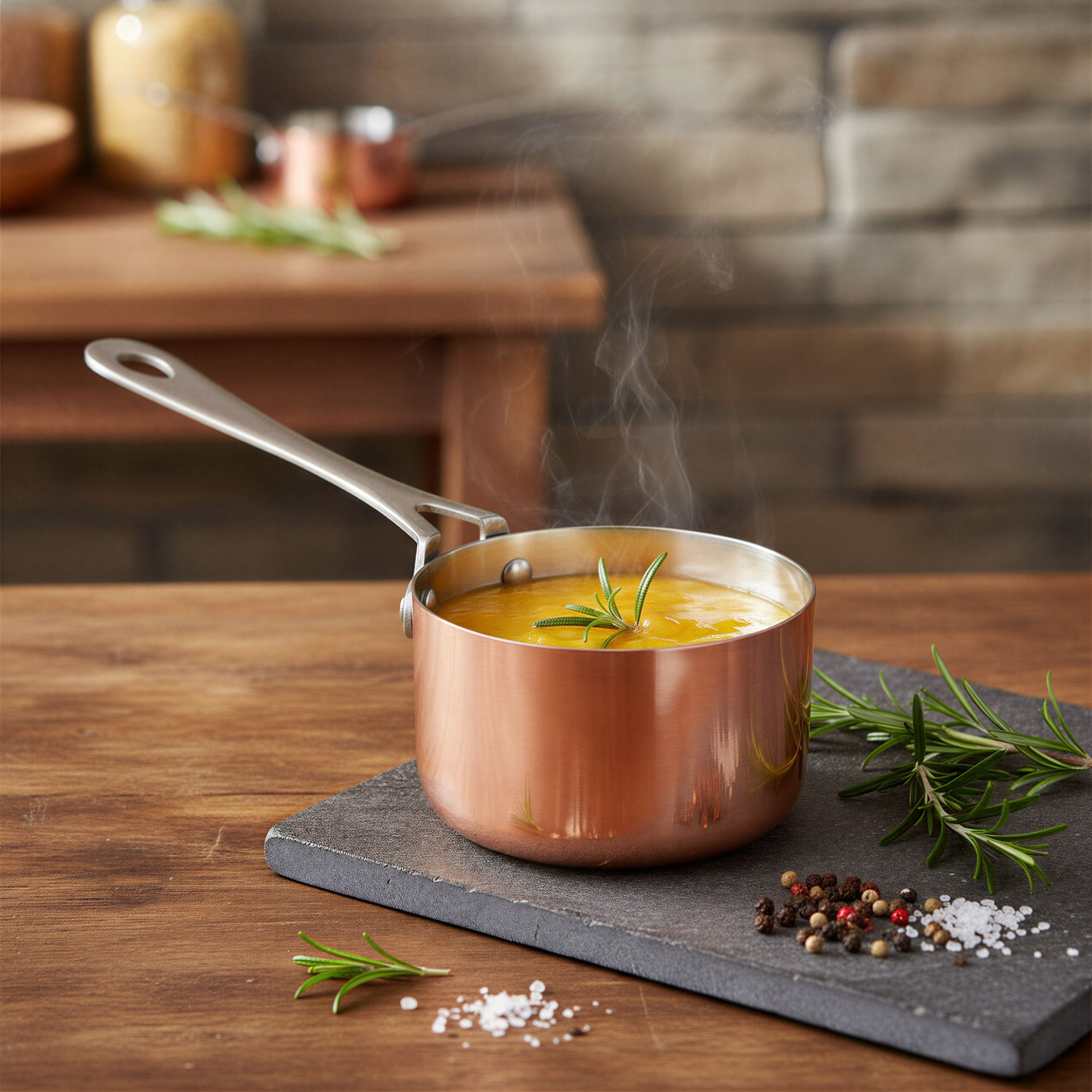 Mały garnuszek ze stali miedziowanej świetnie nadaje się do serwowania i smażenia potraw, a przy tym pasuje do kuchenek gazowych i elektrycznych.