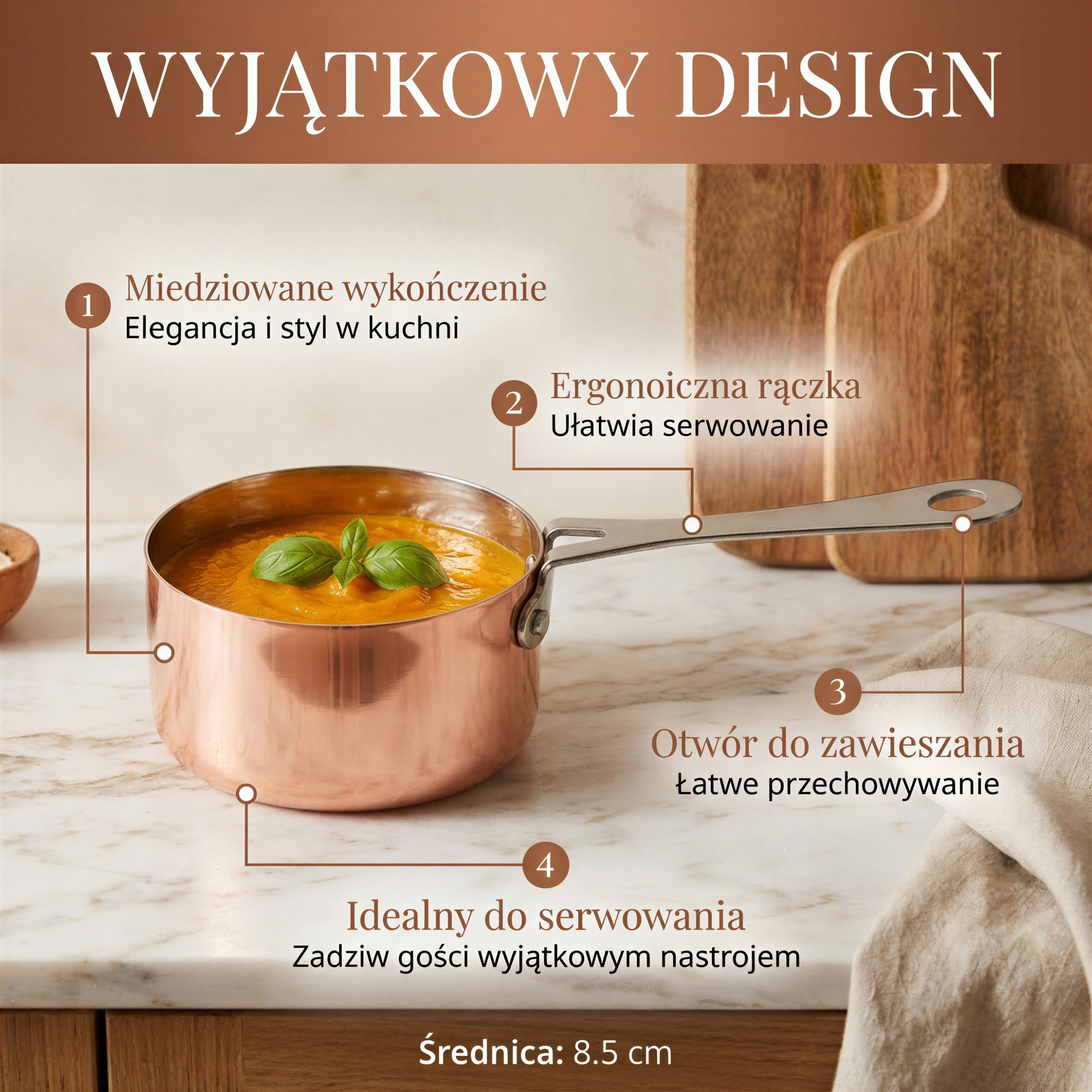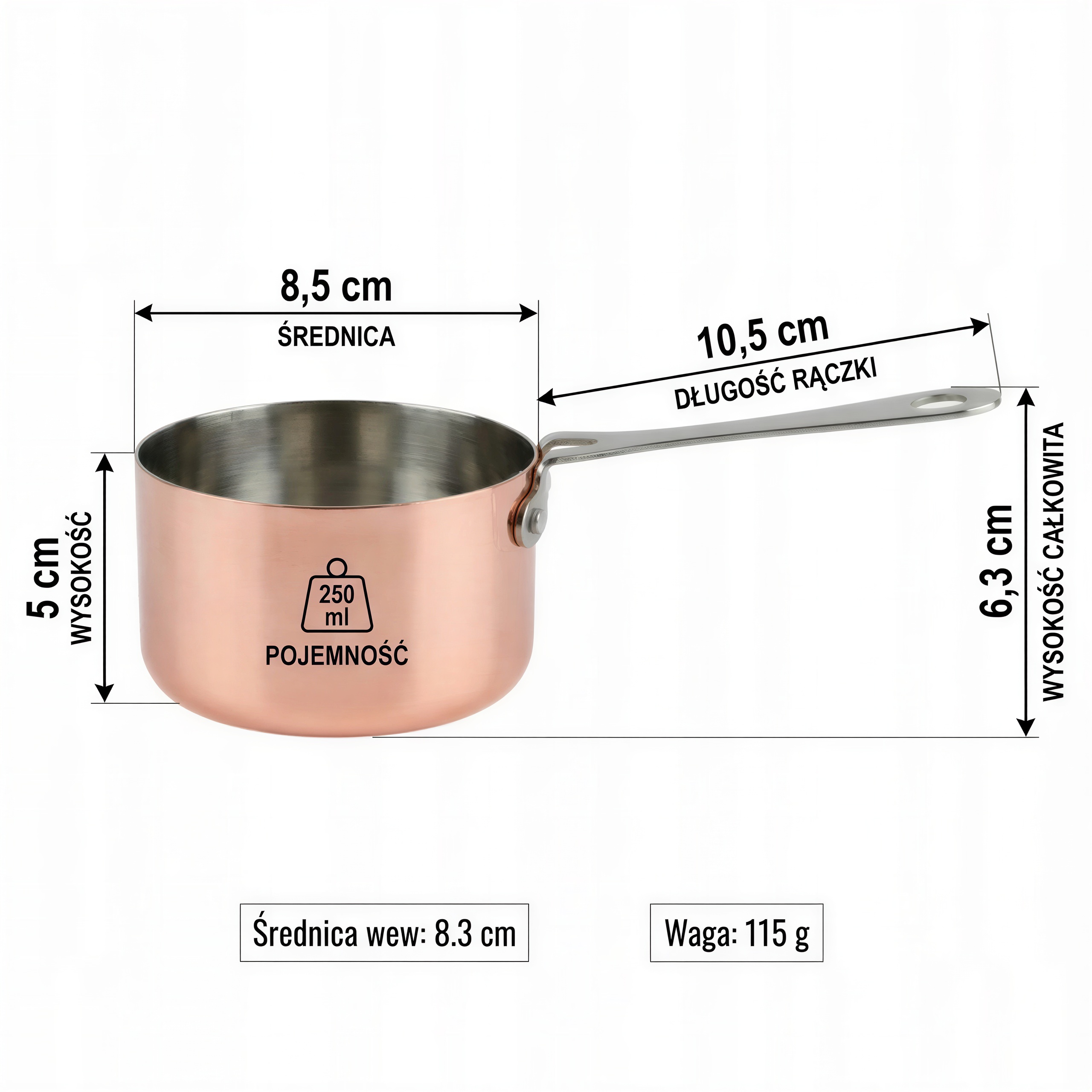 Jeśli szukasz stylowego, miedziowanego garnuszka stalowego o pojemności 250 ml, który świetnie sprawdzi się do serwowania ulubionych potraw, to GARNEK MINI DO SMAŻENIA SERWOWANIA PODAWANIA MAŁY GARNUSZEK 250 ML STALOWY z serii [MODEL/SERIA] jest stworzony dla Ciebie. Ten srebrny, kompaktowy garnek o średnicy Ø 8,5 cm łączy w sobie tradycję z praktycznością, doskonale nadając się na kuchenkę gazową i elektryczną.