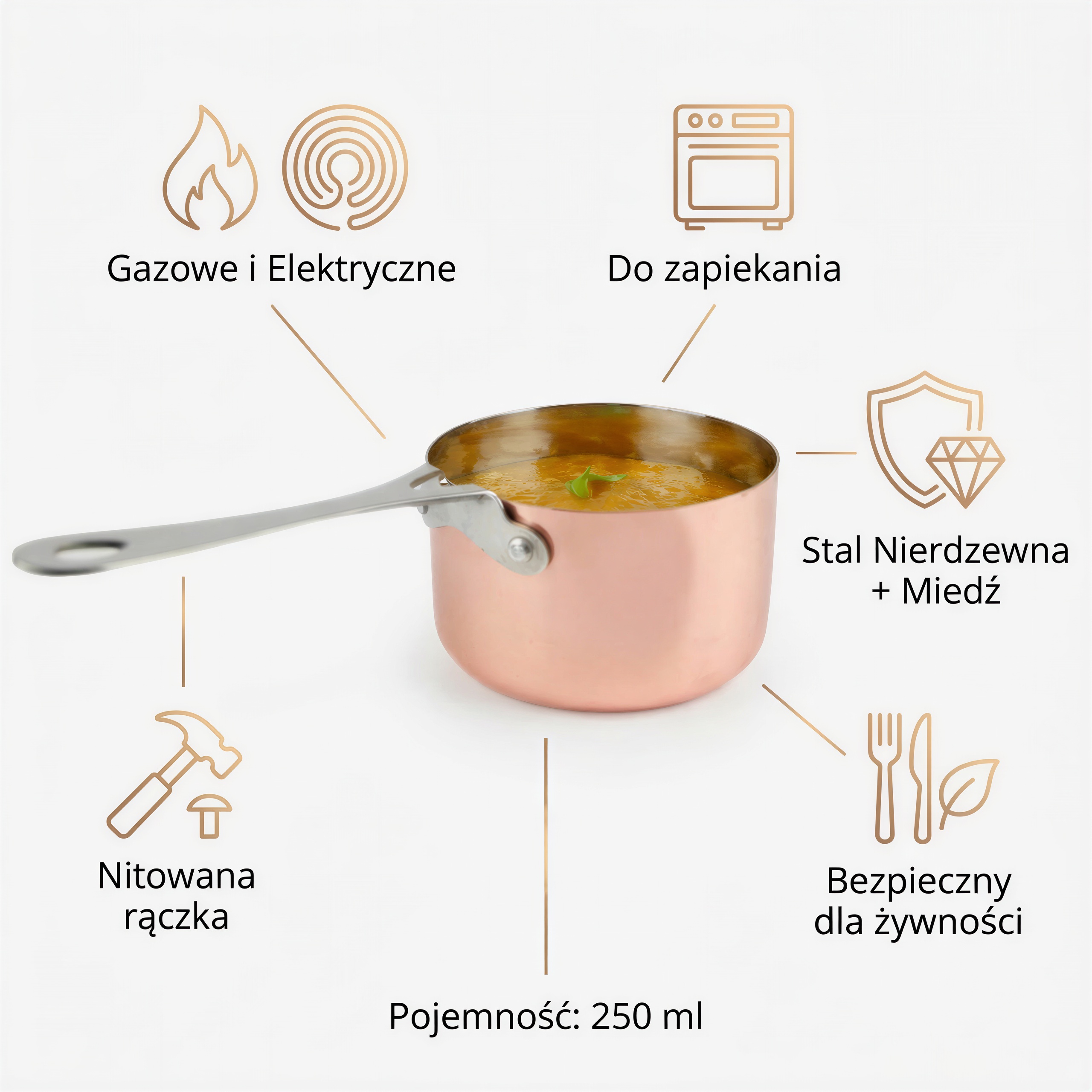 Masz dość ciągłego bałaganu i nieporęcznych garnków, które nie pasują do Twojej kuchni? Często trudno jest znaleźć naczynie na małą porcję lub coś do efektownego podania bez zbędnego zamieszania. Garnek mini do smażenia i serwowania o pojemności 250 ml to właśnie to, czego potrzebujesz! Wykonany z miedziowanego, nierdzewnego metalu, świetnie sprawdzi się na kuchenkach gazowych i elektrycznych, a także do zapiekania potraw. Dzięki niemu Twoje dania nie tylko będą smakować lepiej, ale także pięknie wyglądać na stole. ☕✨ Po prostu więcej radości z gotowania i podawania, bez nadmiaru naczyń i stresu. Twój rytuał kulinarny nabierze nowego blasku! ❤️