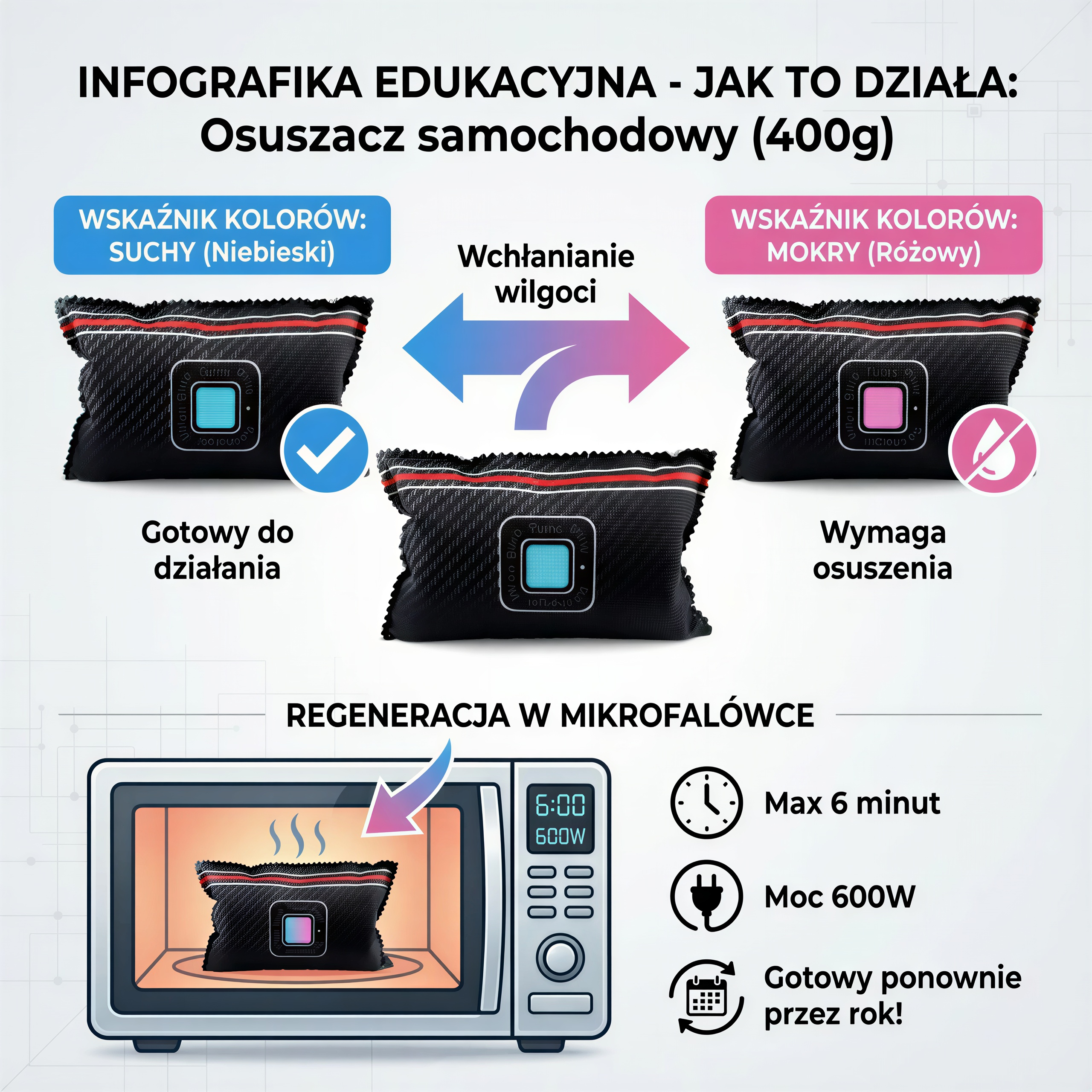 - ✅ Wydajne pochłanianie wilgoci – aż 400G pojemności zapewnia długotrwałą ochronę przed wilgocią w samochodzie i nie tylko.