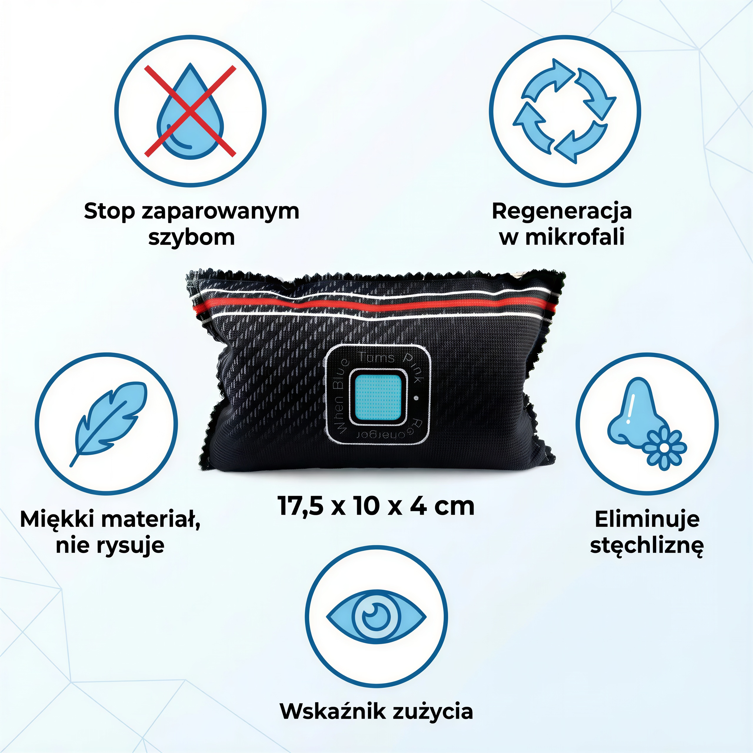 Ten czarny, kompaktowy osuszacz o wymiarach 17,5×10×4 cm ma w środku specjalne kulki, które wchłaniają wilgoć i zatrzymują ją bezpiecznie. Miękki materiał pokrycia sprawia, że nie musisz się martwić o zarysowania wnętrza auta. Gdy wskaźnik zmienia kolor z niebieskiego na różowy, wiesz, że czas na regenerację – wystarczy kilka minut w mikrofalówce.