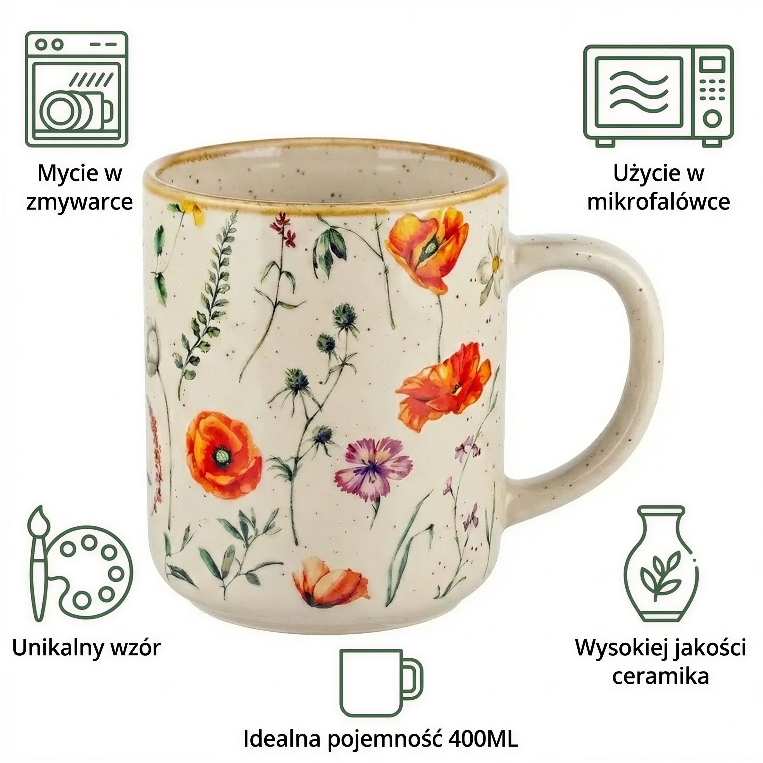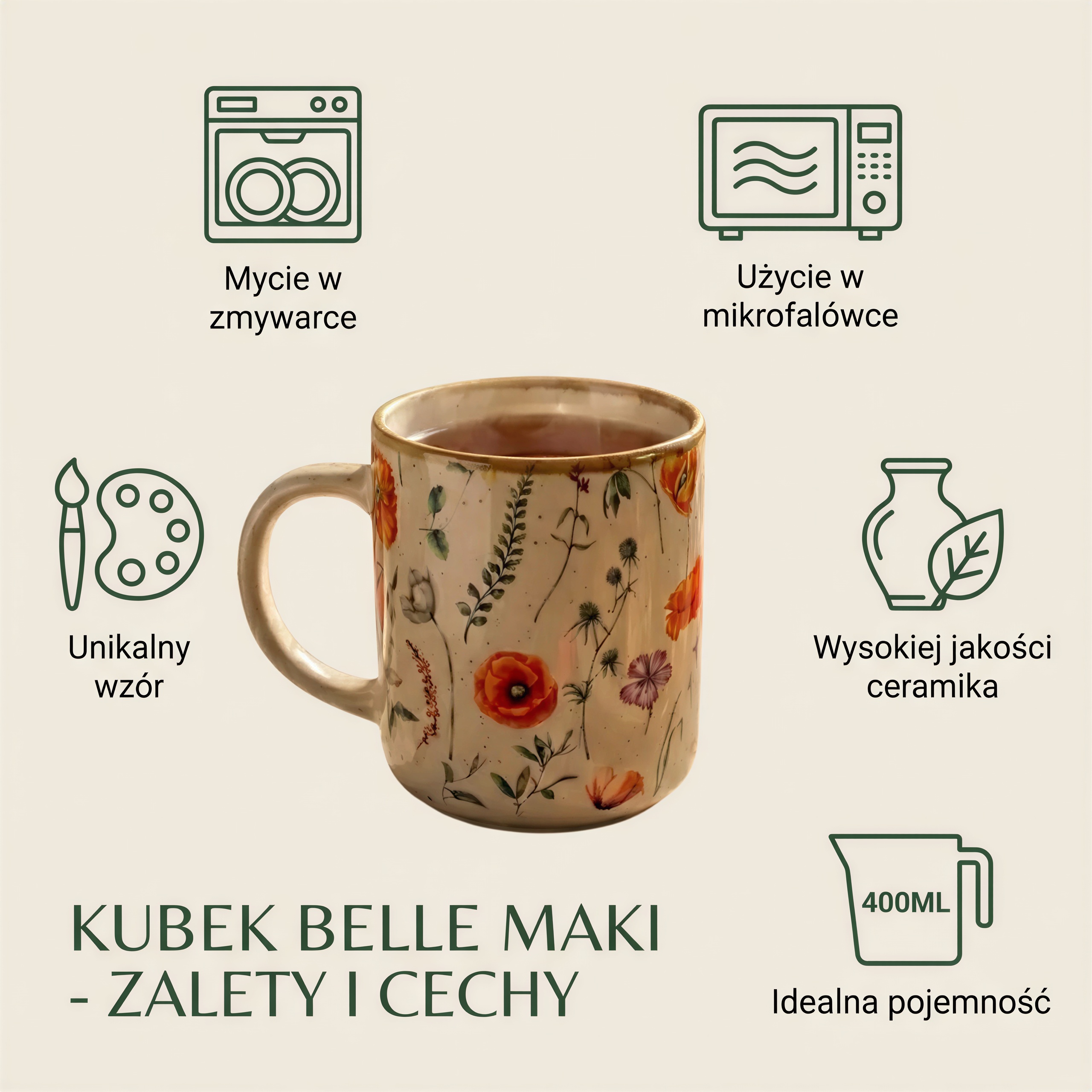 Chcesz zacząć dzień od chwili spokoju i prawdziwego relaksu? BELLE LINE KUBEK 400 ML MAK to idealny towarzysz do herbaty, kawy, kakao czy ziół. Wykonany z trwałej ceramiki o pojemności 400 ml, z pięknym, bezrowym wzorem maków, który wnosi do Twojej kuchni odrobinę sielskiej elegancji.