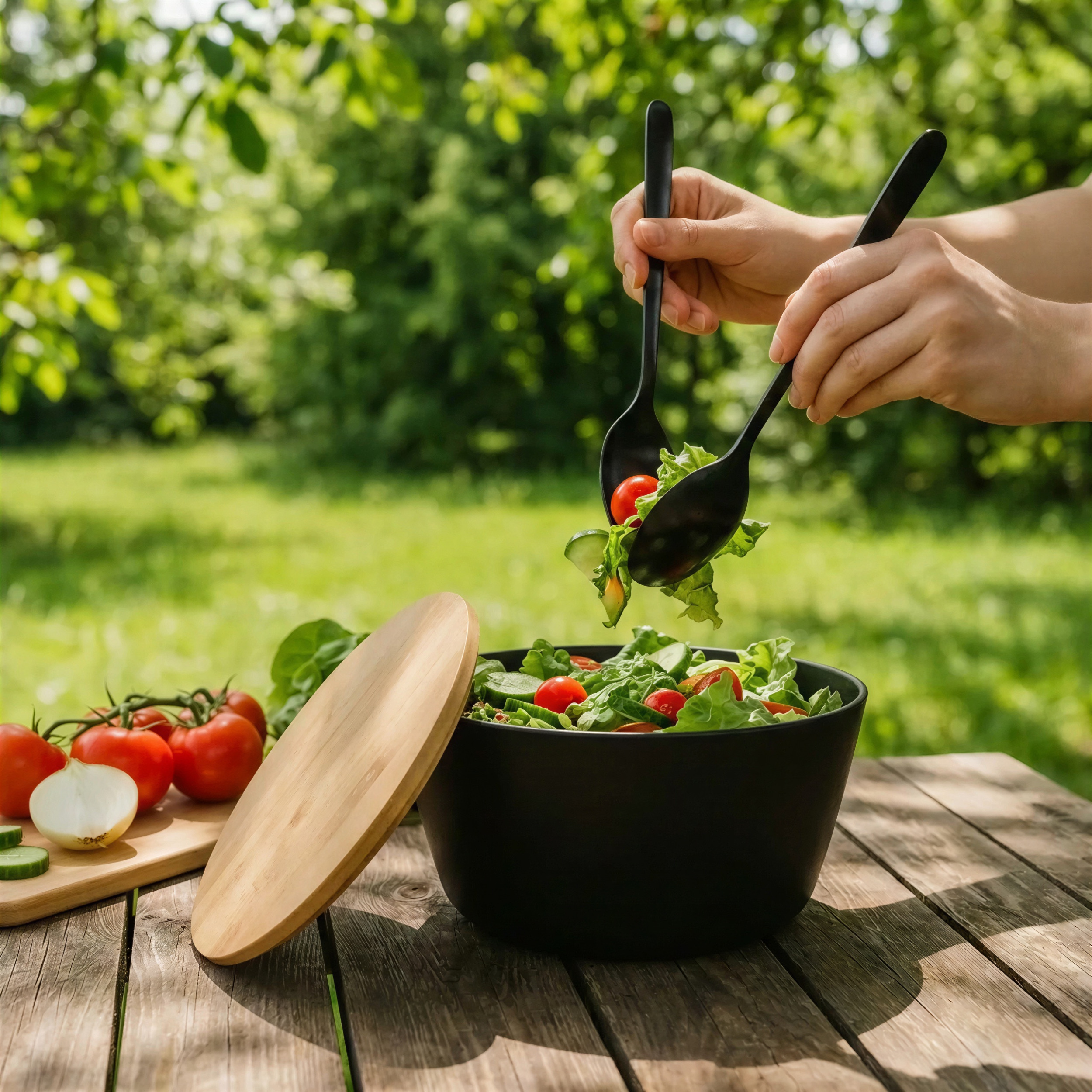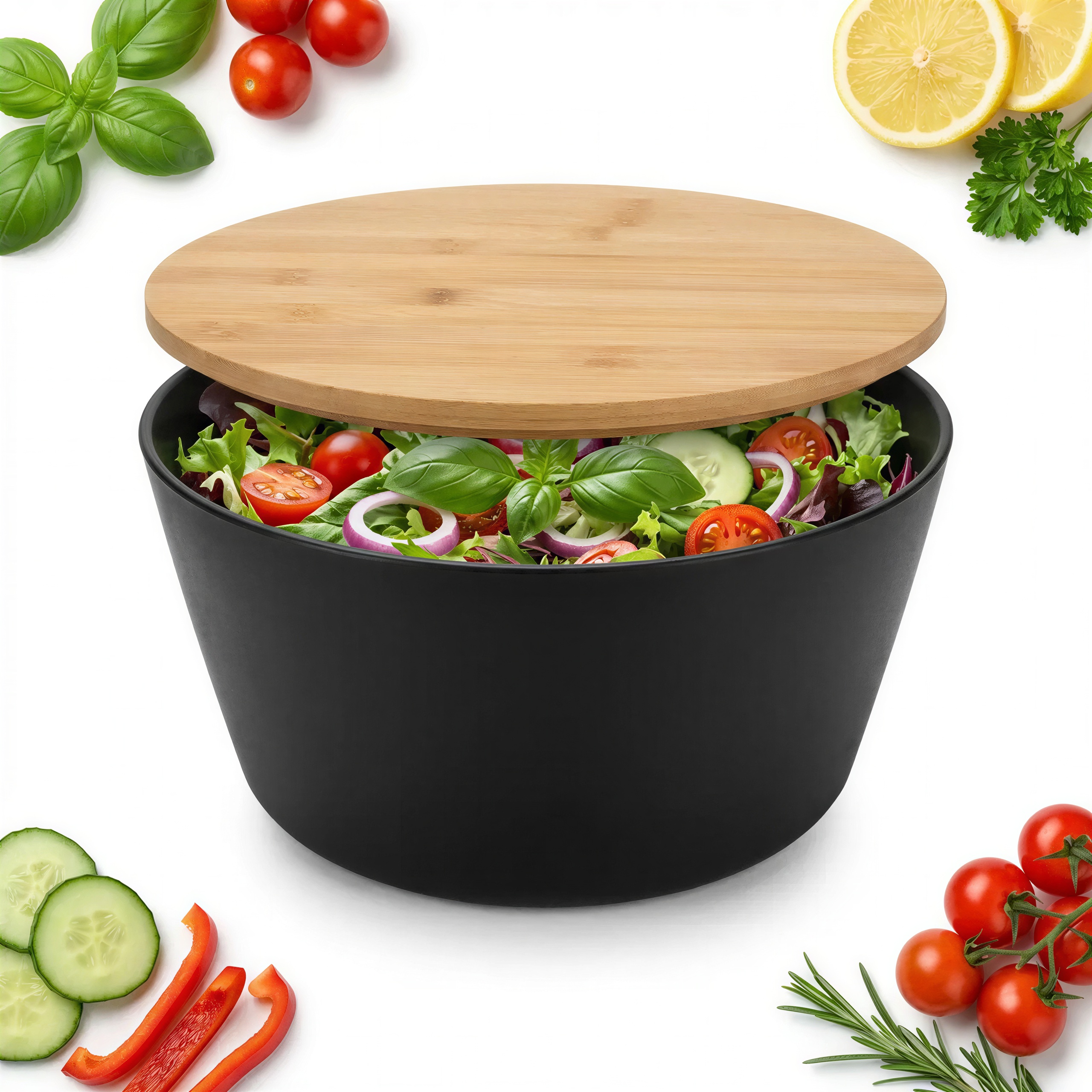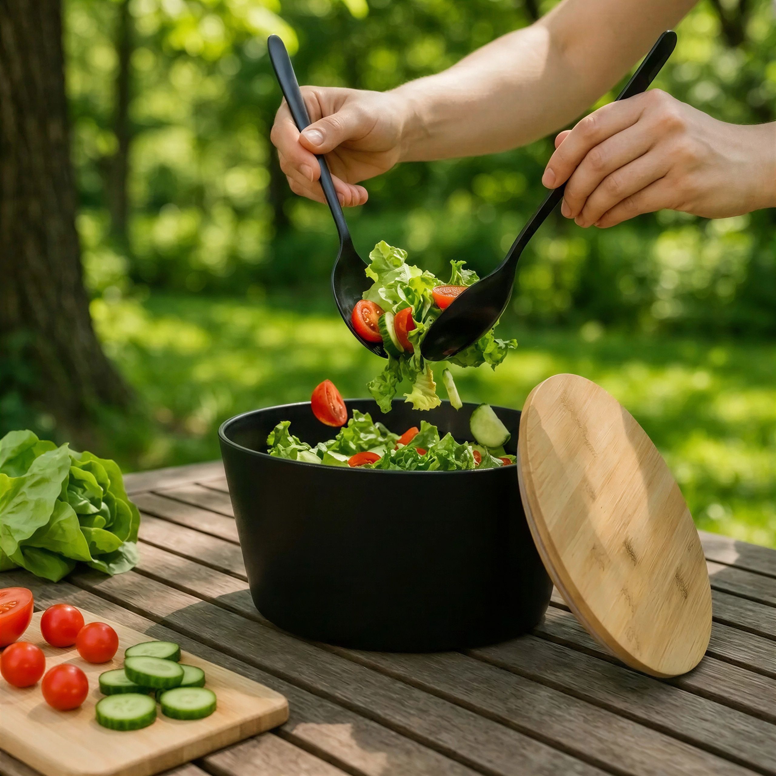 Dotykając gładkiej powierzchni miski, czujesz jej lekkość i solidność. Naturalny, ciepły odcień bambusowej pokrywy kontrastuje z elegancką czernią miski. Przyjemna faktura drewna i subtelny zapach bambusa dodają rytuałowi przygotowywania jedzenia wyjątkowego charakteru. To nie jest zwykły pojemnik, to Twoje nowe ulubione miejsce na świeże smaki.