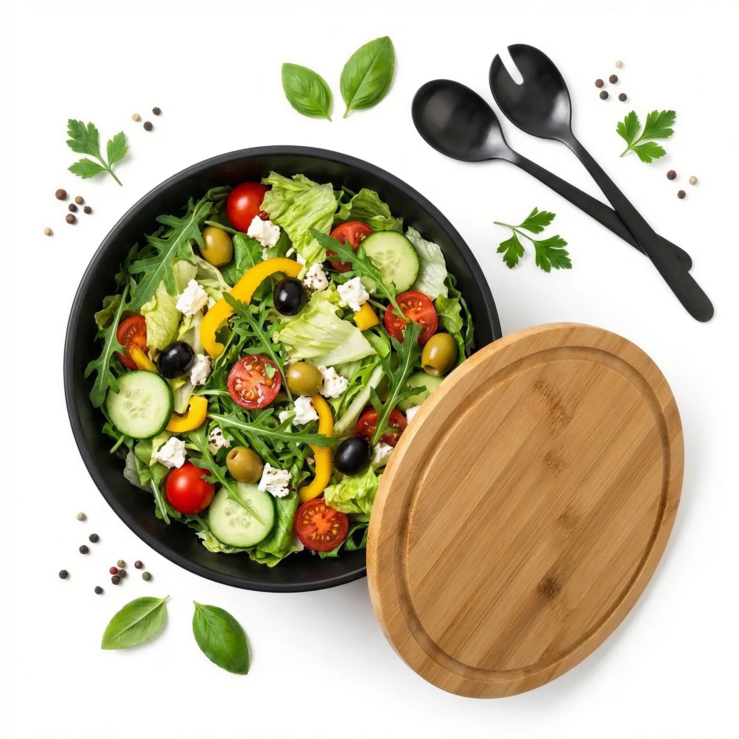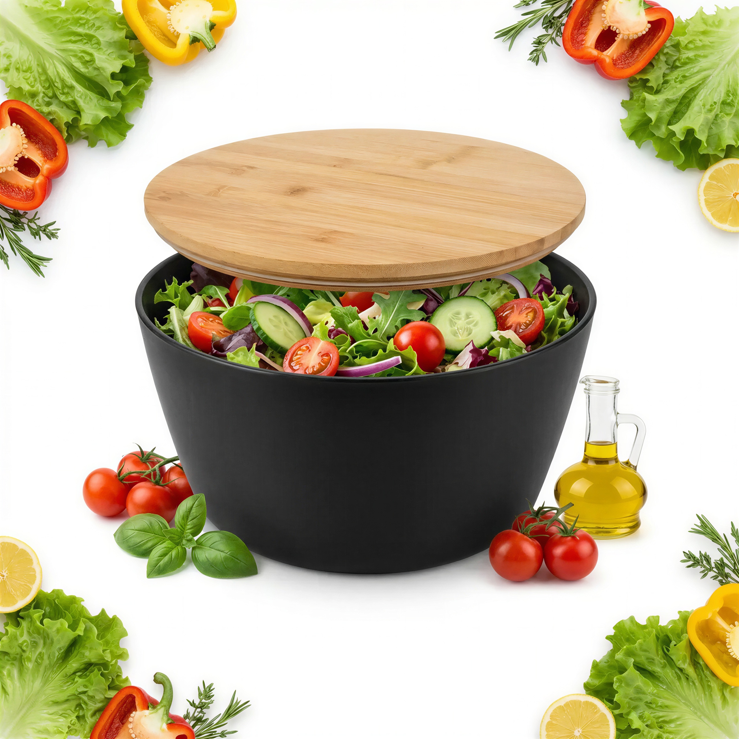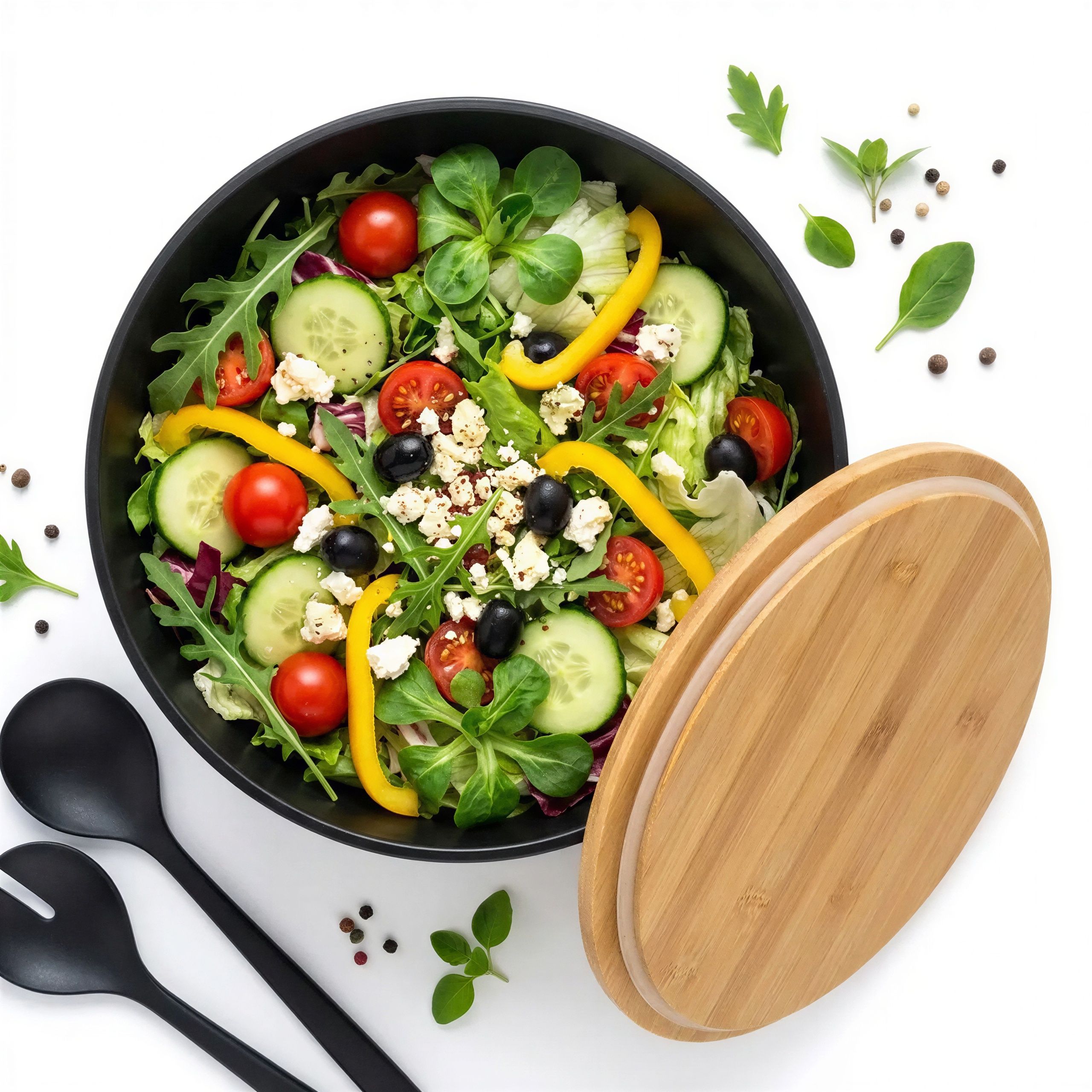 Dotykając gładkiej powierzchni miski, czujesz jej lekkość i solidność. Naturalny, ciepły odcień bambusowej pokrywy kontrastuje z elegancką czernią miski. Przyjemna faktura drewna i subtelny zapach bambusa dodają rytuałowi przygotowywania jedzenia wyjątkowego charakteru. To nie jest zwykły pojemnik, to Twoje nowe ulubione miejsce na świeże smaki.