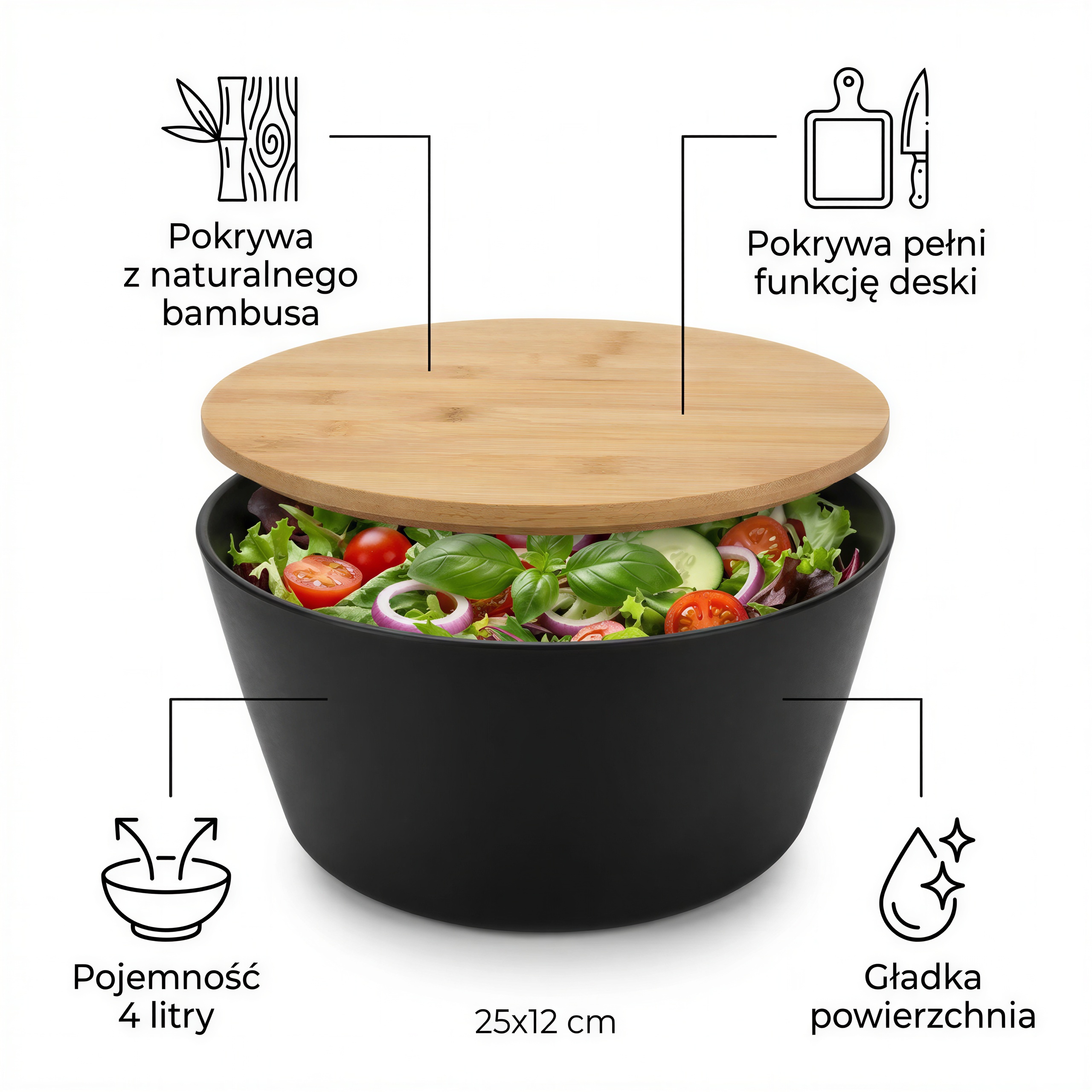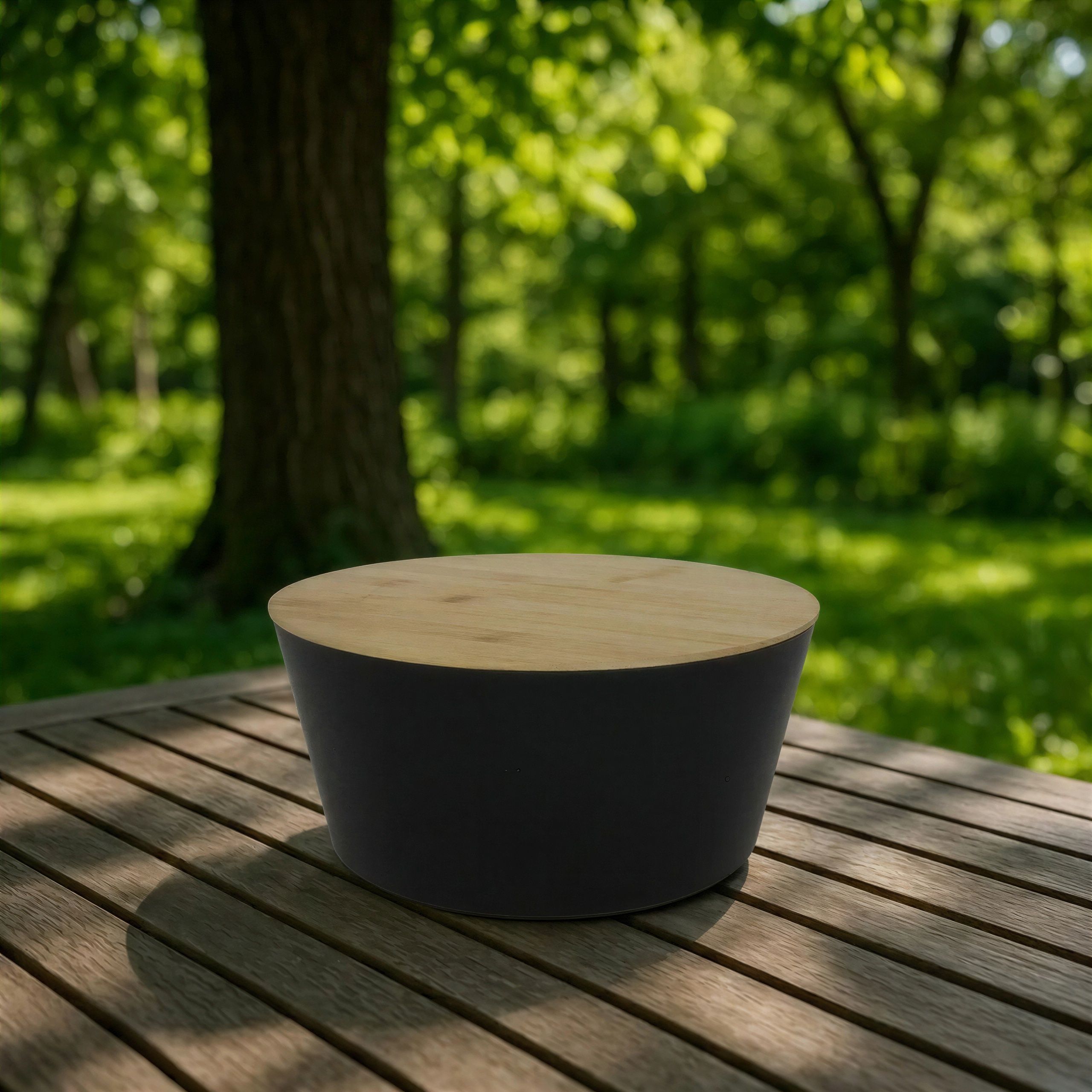 - ✅ ⚡ WYTRZYMAŁE MATERIAŁY – miska z czarnego tworzywa sztucznego i solidna bambusowa pokrywa gwarantują trwałość i estetykę na lata, a średnica 25 cm oferuje praktyczną przestrzeń.