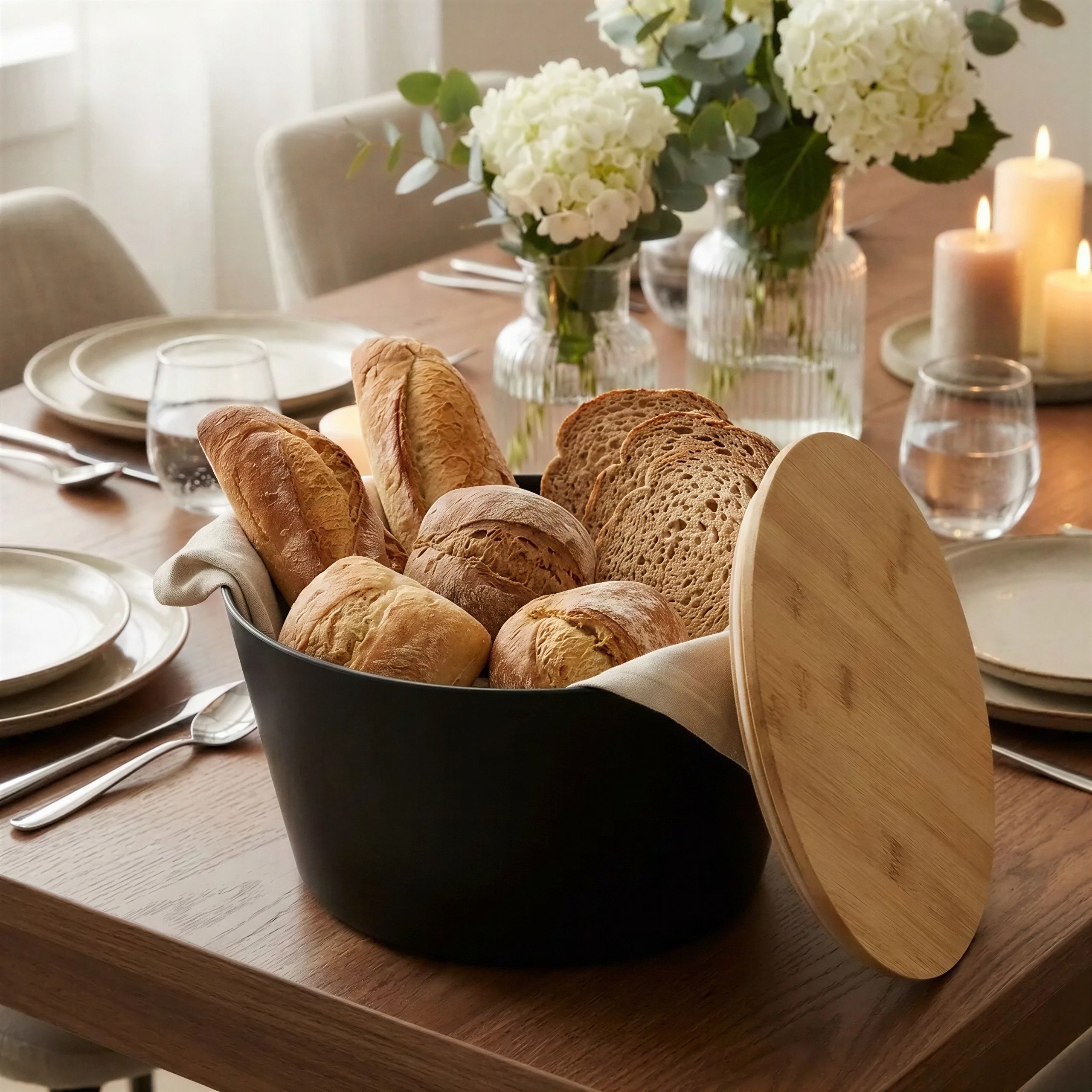 - ✅ Bambusowa pokrywka – chroni zawartość i jednocześnie służy jako praktyczna deska do krojenia.