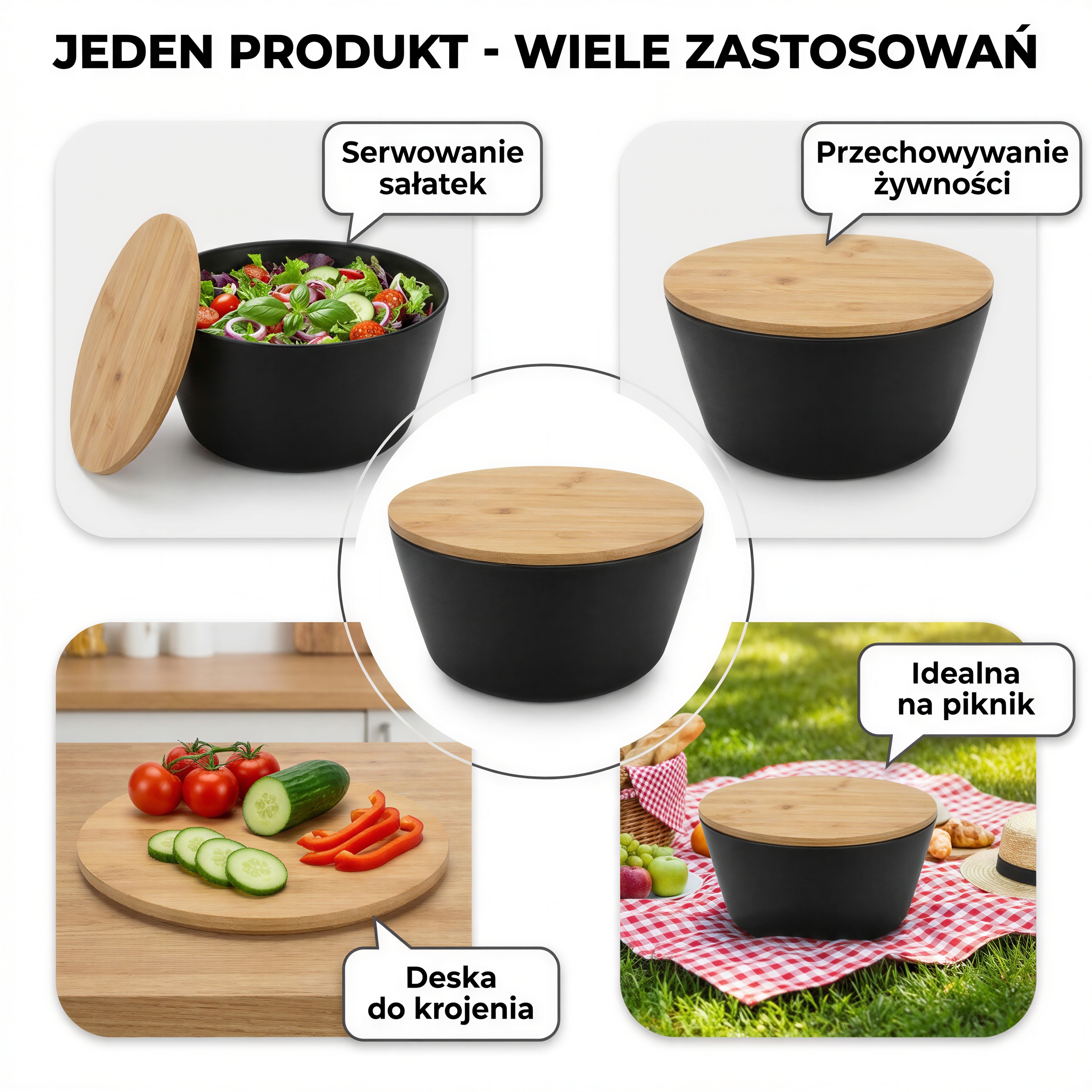 Odkryj funkcjonalność i styl z MISKA CZARNA Z BAMBUSOWĄ POKRYWĄ DESKĄ DO KROJENIA 4L SALATERKA