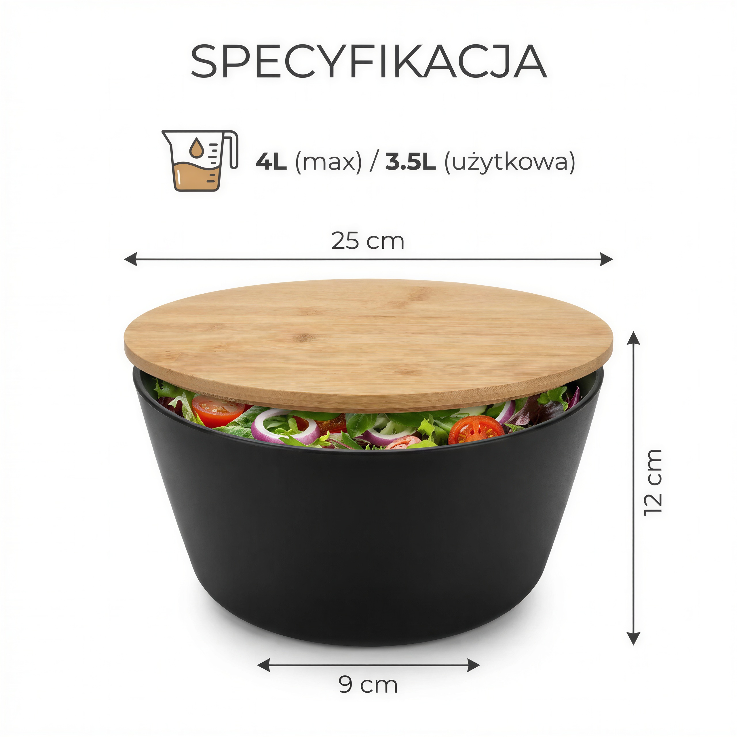 - ✅ Duża pojemność 4L – zmieścisz w niej sporo sałatek, owoców czy innych produktów.